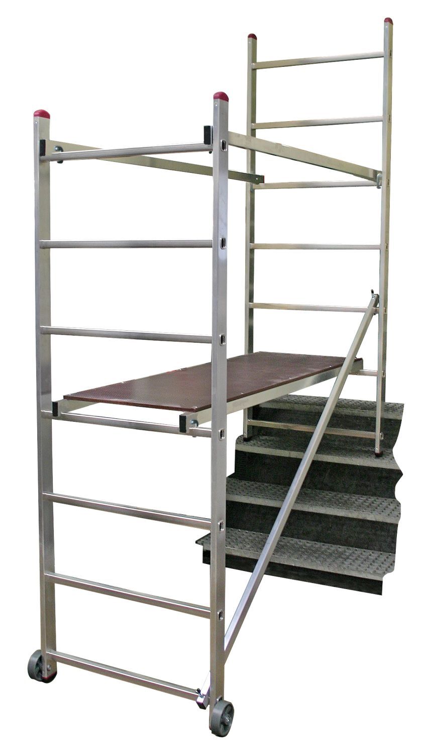Das leichte Kleingerüst ist durch seine geringe Höhe auch durch Türen, etc. gefahren werden. Mit den 2 Fahrrollen an den Holmenden kann das Gerüst auch als Fahrgerüst verwendet werden. Die Benutzung auf der Treppe ist auch kein Problem, da die Vertikalrahmen des Arbeitsgerüstes in der Höhe unabhängig voneinander aufgebaut werden können. Die stabile Konstruktion besitzt eine wetterfeste und rutschsichere Belagbühnenfläche.