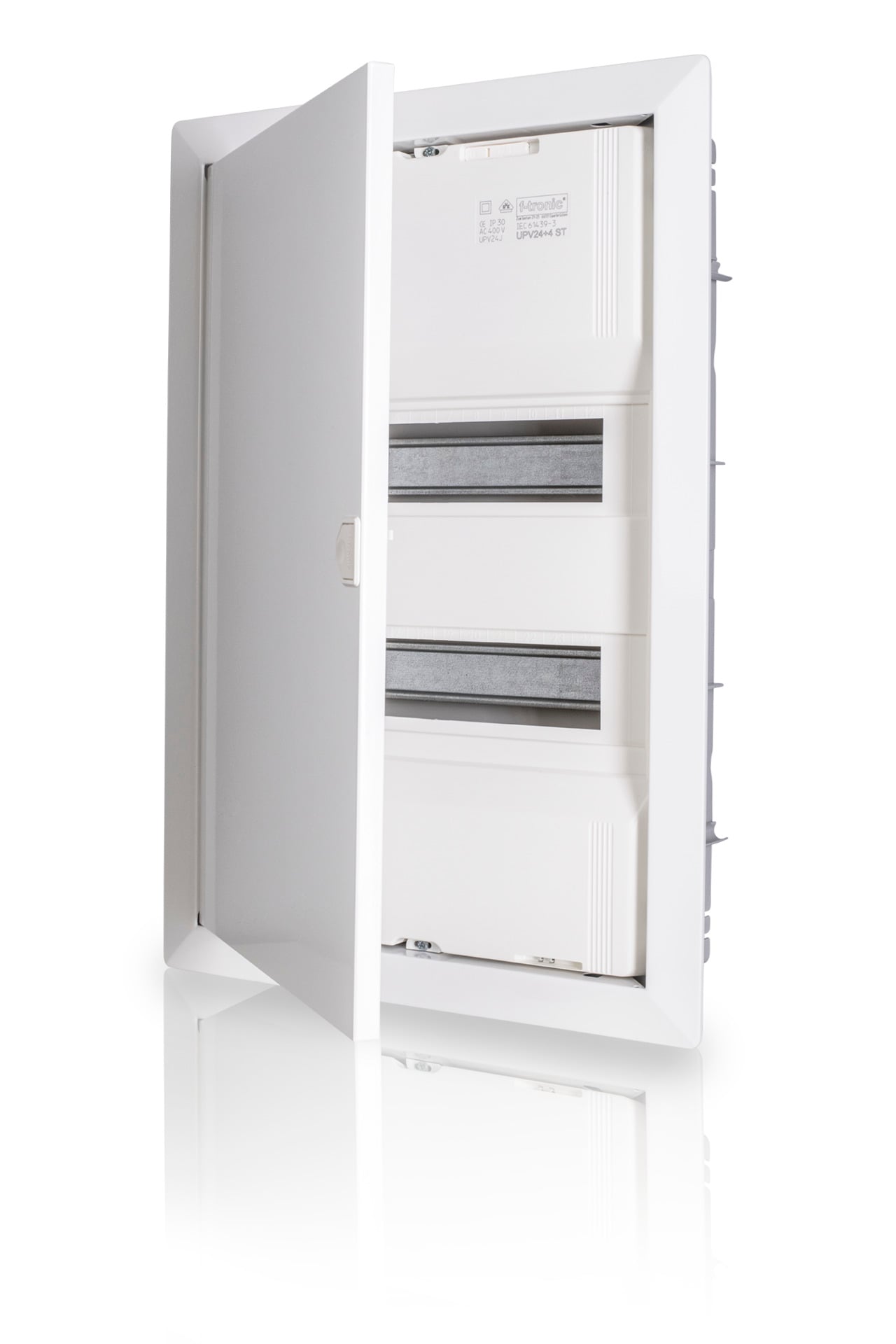 Der Unterputz-Kleinverteiler besteht aus schlagfesten Kunststoff und einer Tür aus Stahlblech.