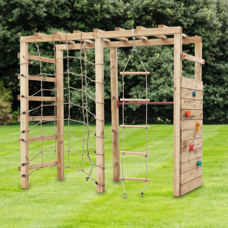 Das ALEM Klettergerüst ist ideal, wenn du Kindern im Garten eine sportliche Spielanlage mit mehreren Kletterelementen bieten möchtest. Reckstange, Kletternetz und Kletterwand sorgen für Abwechslung und fördern ganz nebenbei Kraft, Koordination und Mut, ohne dass du dafür viel Fläche einplanen musst. Gefertigt aus druckimprägnierter Kiefer und Fichte ist das Gerüst für draußen gemacht und kommt als Bausatz zu dir. Eine Strickleiter kannst du separat ergänzen, sie gehört nicht zum Lieferumfang. Für einen sicheren Stand empfiehlt sich zusätzlich die Verankerung mit sechs TOM Erdankern. Das Klettergerüst ist für den privathäuslichen Bereich gedacht und nicht für Kinder unter 3 Jahren geeignet. Technische Daten Maße L x B x H 240 x 120 x 220 cm Material Holz, Kiefer/Fichte Oberfläche Druckimprägniert Ausstattung Kletternetz, Reckstange, Kletterwand Option Strickleiter separat erhältlich, nicht im Lieferumfang Hinweis Nur für den privathäuslichen Bereich, nicht für Kinder unter 3 Jahren, für mehr Standsicherheit 6 TOM Erdanker mitbestellen Marke, Hersteller T&J Anwendung Spielanlage Irrtümer oder Änderungen vorbehalten.
