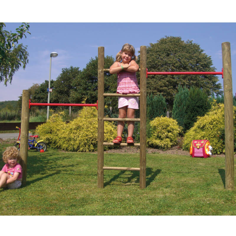 MAIK Kletterreck – Turnspaß für den heimischen Garten Mit dem MAIK Kletterreck bringst du vielseitige Bewegungsmöglichkeiten in deinen Garten. Es besteht aus kesseldruckimprägniertem Kiefer- und Fichtenholz und eignet sich ideal für kleine Kletterfans, die sich gern austoben. Das Spielgerät bietet mit zwei roten Reckstangen und einer praktischen Sprossenleiter viele Turnmöglichkeiten – und das auf kompaktem Raum. Spielgerät mit durchdachtem Aufbau Die Sprossenleiter misst 60 x 250 cm und hilft Kindern, sicher zur Reckstange zu gelangen. So können auch kleinere Kinder problemlos turnen. Die Konstruktion besteht aus zwei unterschiedlich hohen Pfosten (250 cm und 200 cm), was eine spannende Herausforderung für den Nachwuchs darstellt. Stabiles Holz für lange Lebensdauer Das verwendete Holz ist imprägniert und für den dauerhaften Einsatz im Außenbereich vorbereitet. Die Rundholzpfosten mit einem Durchmesser von 10 cm sorgen für hohe Stabilität und Sicherheit beim Spielen. Das Kletterreck ist ausschließlich für den privaten Gebrauch vorgesehen und nicht für Kinder unter 3 Jahren geeignet. Technische Daten im Überblick Material: Kiefer/Fichte, druckimprägniert Maße gesamt (B x H): 260 x 200 cm Leiter: 60 x 250 cm Pfostenlängen: 200 cm und 250 cm Pfostendurchmesser: 10 cm Rundholz