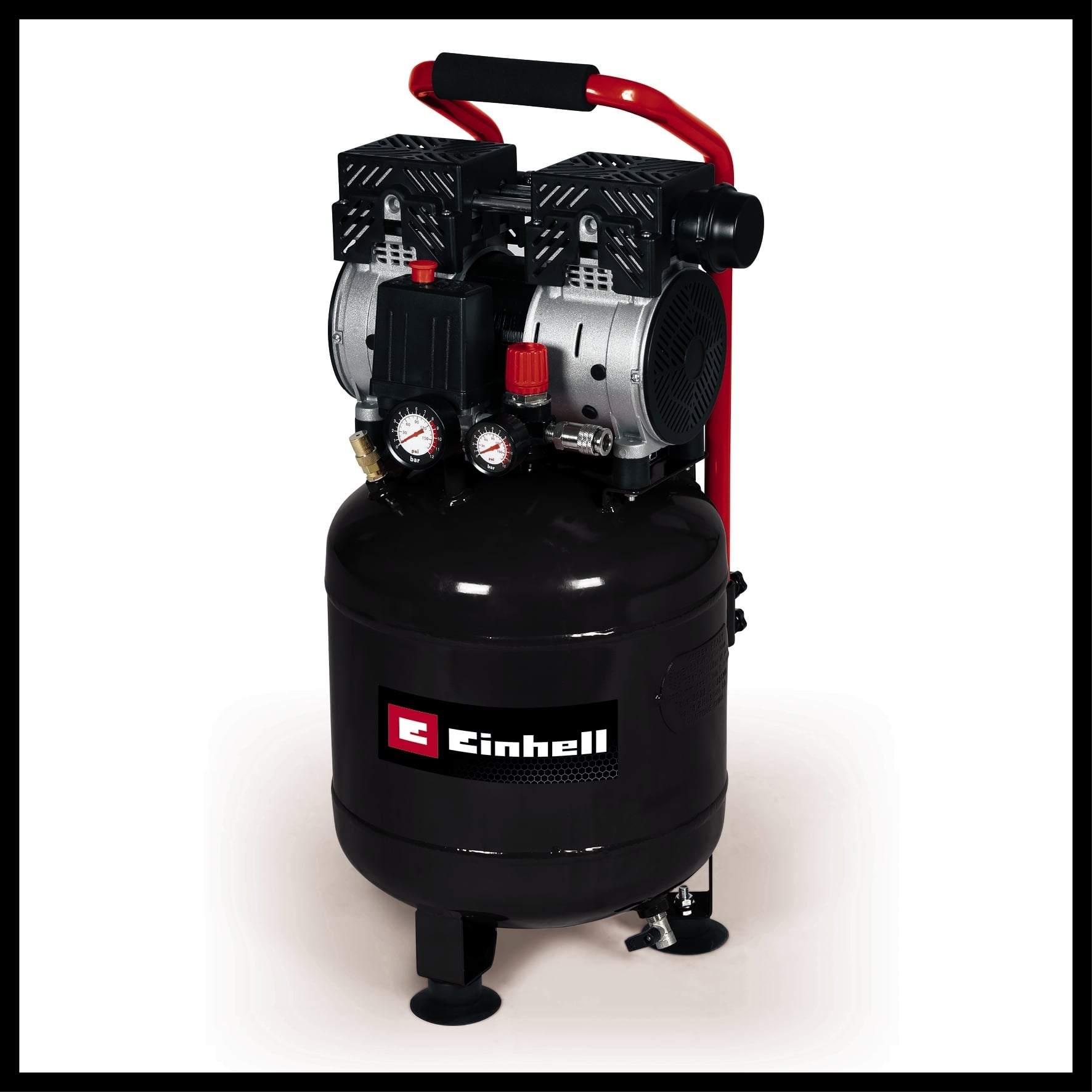 Der Kompressor TE-AC 135/24 Silent Plus zeichnet sich durch eine geringe Geräuschentwicklung von 57dB (LpA-Wert) aus – ein Flüsterkompressor, deutlich leiser als übliche Geräte mit gleicher Leistung. Er verfügt über einen öl- und servicefreien Motor mit geringem Wartungsaufwand, eine Entwässerungsschraube für eine komfortable Wartung, ein Sicherheitsventil, Manometer und Schnellkupplung für den geregelten Arbeitsdruck sowie einen Druckminderer für Anwendungen bis 8 bar. Der 24 l-Tank bietet ausreichend Luftreserven. Einhell bietet 10 Jahre Garantie gegen Durchrostung des Kessels. mit wenigen Handgriffen lässt er sich transportieren, vibrationsdämpfende Standfüße sorgen für sicheren Stand und die stehende Bauweise für eine platzsparende Aufbewahrung.