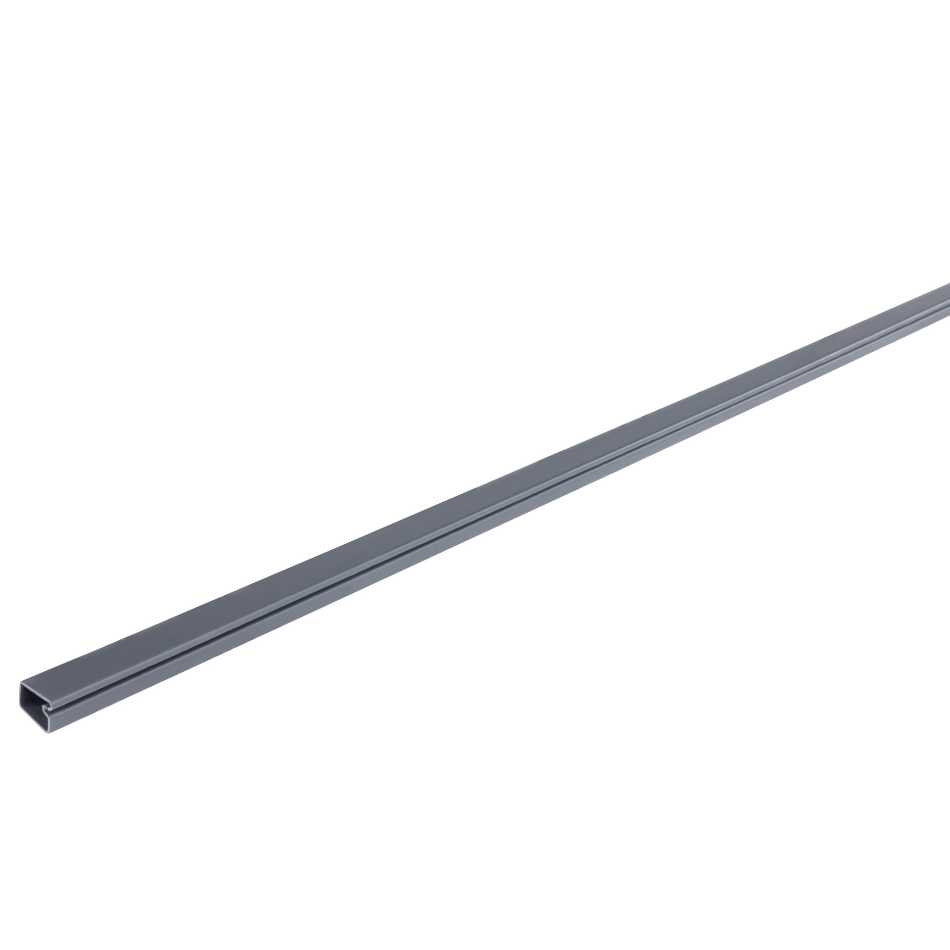 Anthrazitfarbener Kabelkanal mit Klebefolie auf der Kanalunterseite und klappbarem Deckel.