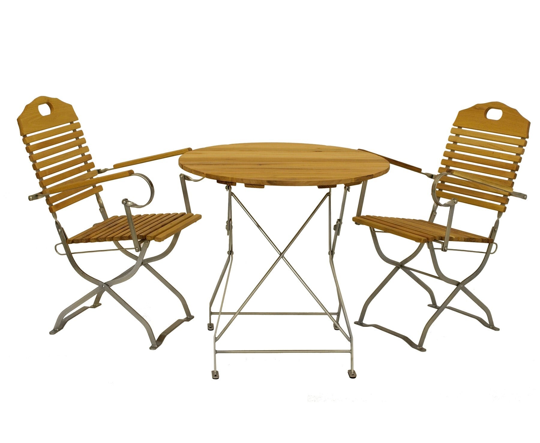 Kurgarten – Garnitur 3-teilig ( 2x Armlehnensessel, 1x Tisch 77cm rund), Gestell Flachstahl verzinkt + transparent pulverbeschichtet, Latten Robinie, klappbar