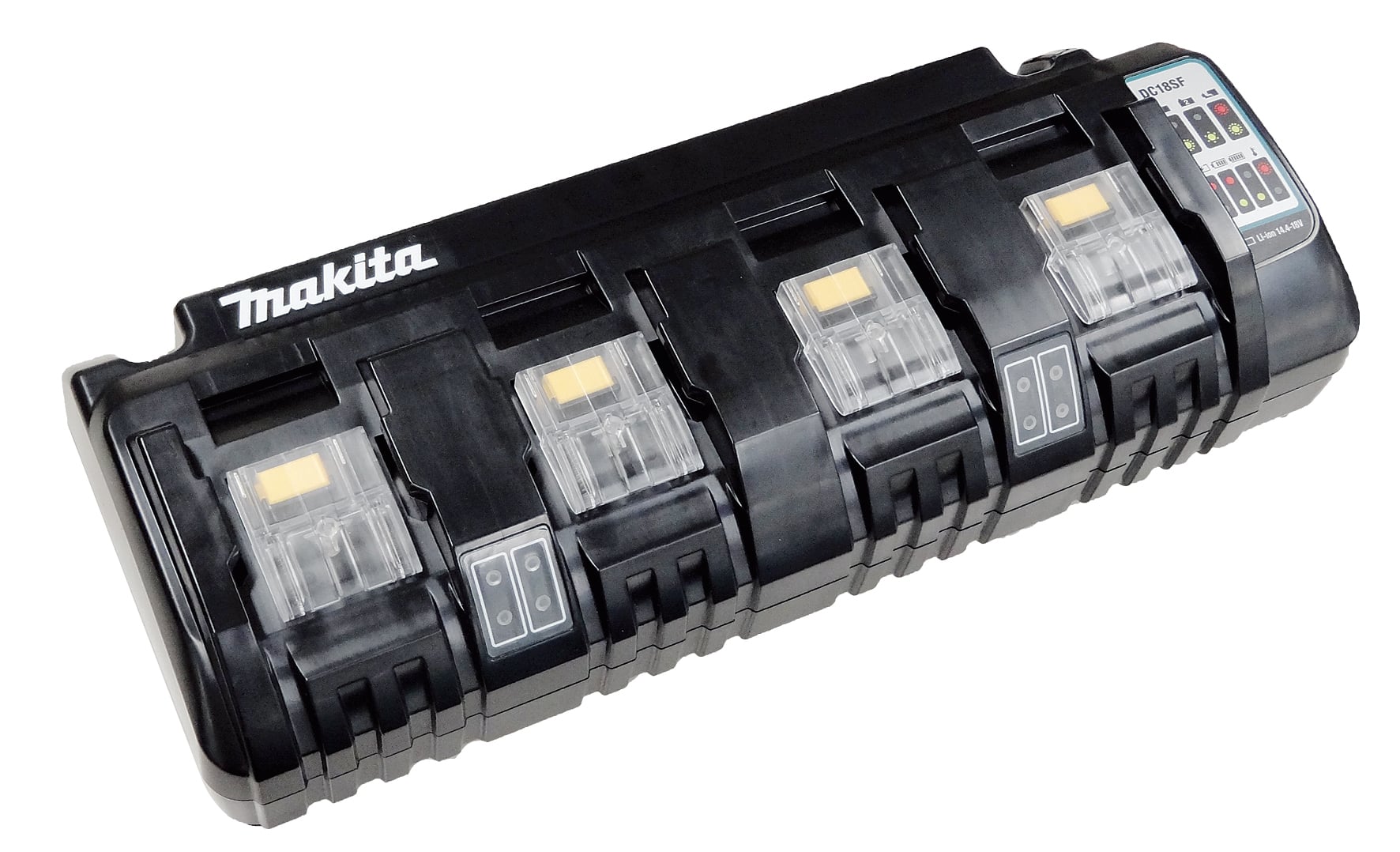 4-fach Ladegerät zum gleichzeitigen Laden von bis zu 4 Akkus auch mit unterschiedlicher Kapazität. Ladezeit bei 2 Akkus mit 3,0 Ah 30 MInuten, bei 4,0 Ah 90 MInuten, bei 5,0 Ah 110 Minuten, bei 6,0 Ah 130 Minuten. Beim gleichzeitigen Laden von 4 Akkus verdoppelt sich die Ladezeit. Für Makita Li-Ion-Akkus 14,4 – 18 V. Mit Ladeluftkühlung und LadezustandsanzeigeModell DC18SF