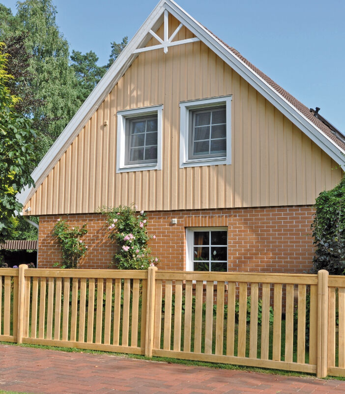 ANTONIO-Rahmenzaun Der ANTONIO-Rahmenzaun ist aus hochwertiger Eiche gefertigt und bietet Ihnen die Möglichkeit Ihren Garten auf schlichte Art und Weise umzuzäunen. Die Gestaltungsmöglichkeiten sind mit dem 180 x 90 cm großen Zaun unbegrenzt. Die Latten haben ein Maß von ca. 20 x 80 mm und werden zwischen den beiden Rahmenbrettern verschraubt, dadurch wird eine hohe Stabilität erzeugt. Technische Daten: aus roher Eiche 180 x 90 cm Latten ca. 20 x 80 mm passende Pfosten 9 x 9 cm Kopf mit Bischofsmütze