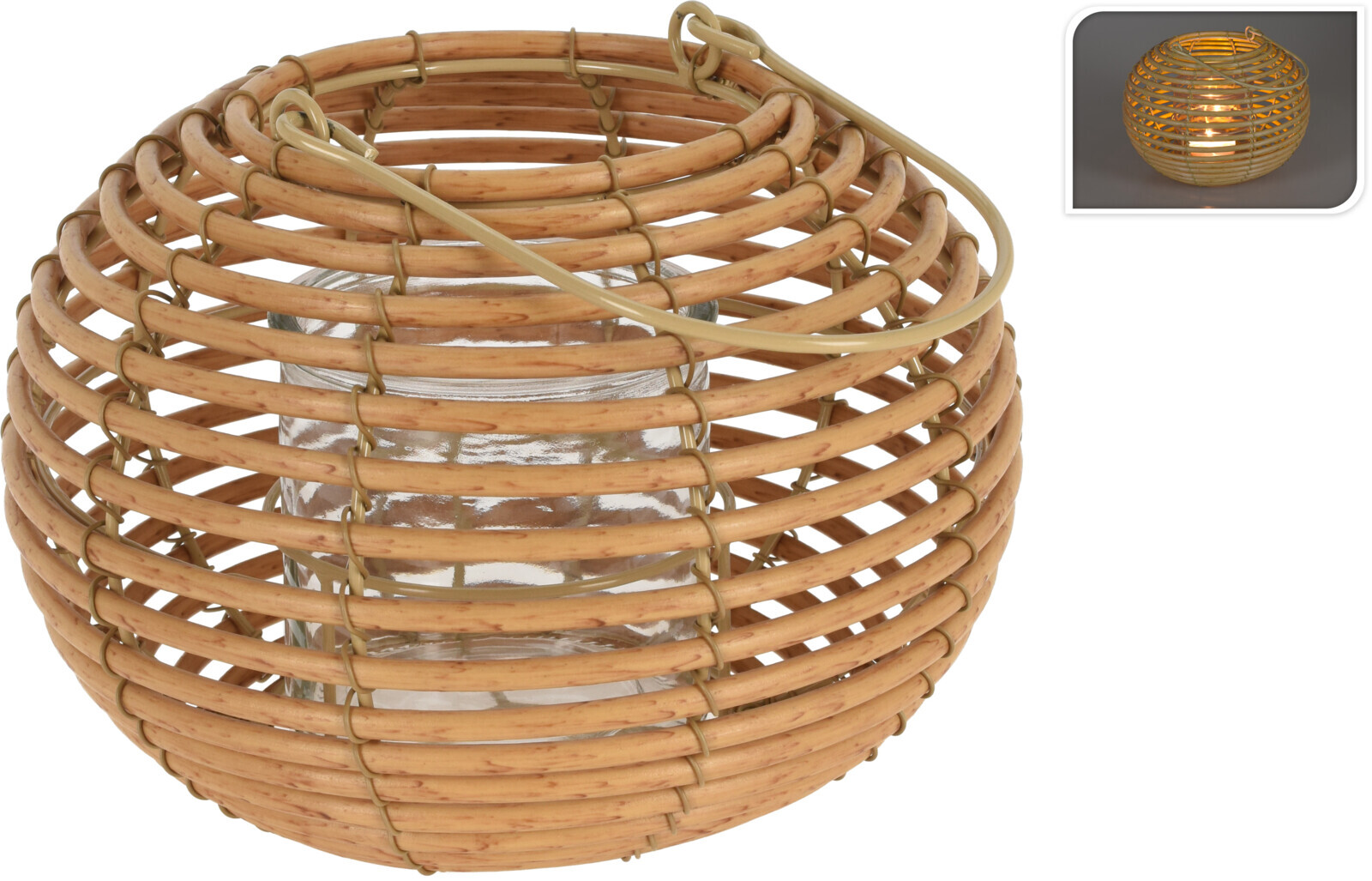 Runde Laterne aus Geflecht mit Glaszylinder, natur