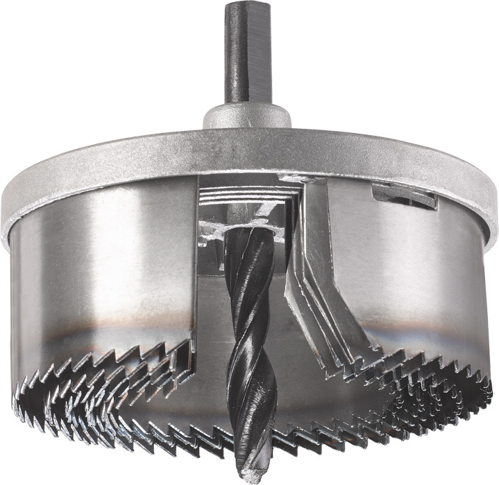 Lochsäge, 5-tlg., mit Sechskant-Aufnahmeschaft, schwerer Aludruckguss-Trägerteller, Sägekränze aus gehärtetem Federstahl, für den Einsatz in Holz, Spanplatten, Gipskarton und Leichtbauplatten.