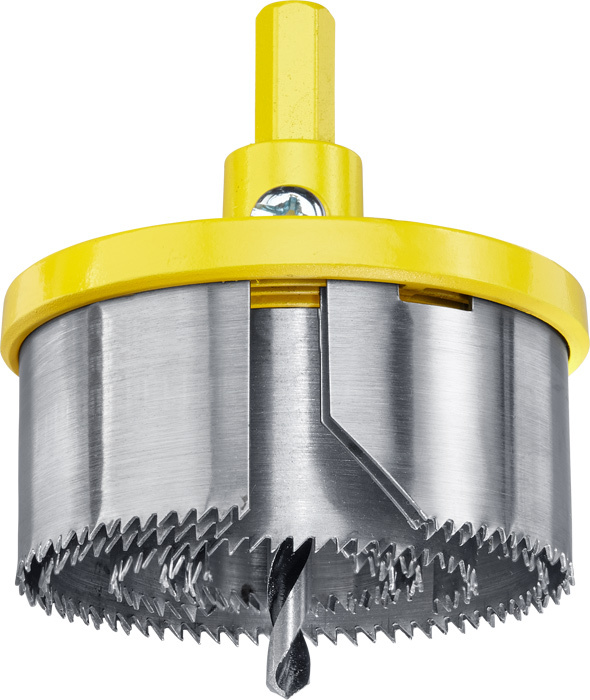 Lochsäge, 5-tlg., mit Sechskant-Aufnahmeschaft, schwerer Aludruckguss-Trägerteller, Sägekränze aus gehärtetem Federstahl, für den Einsatz in Holz, Spanplatten, Gipskarton und Leichtbauplatten.