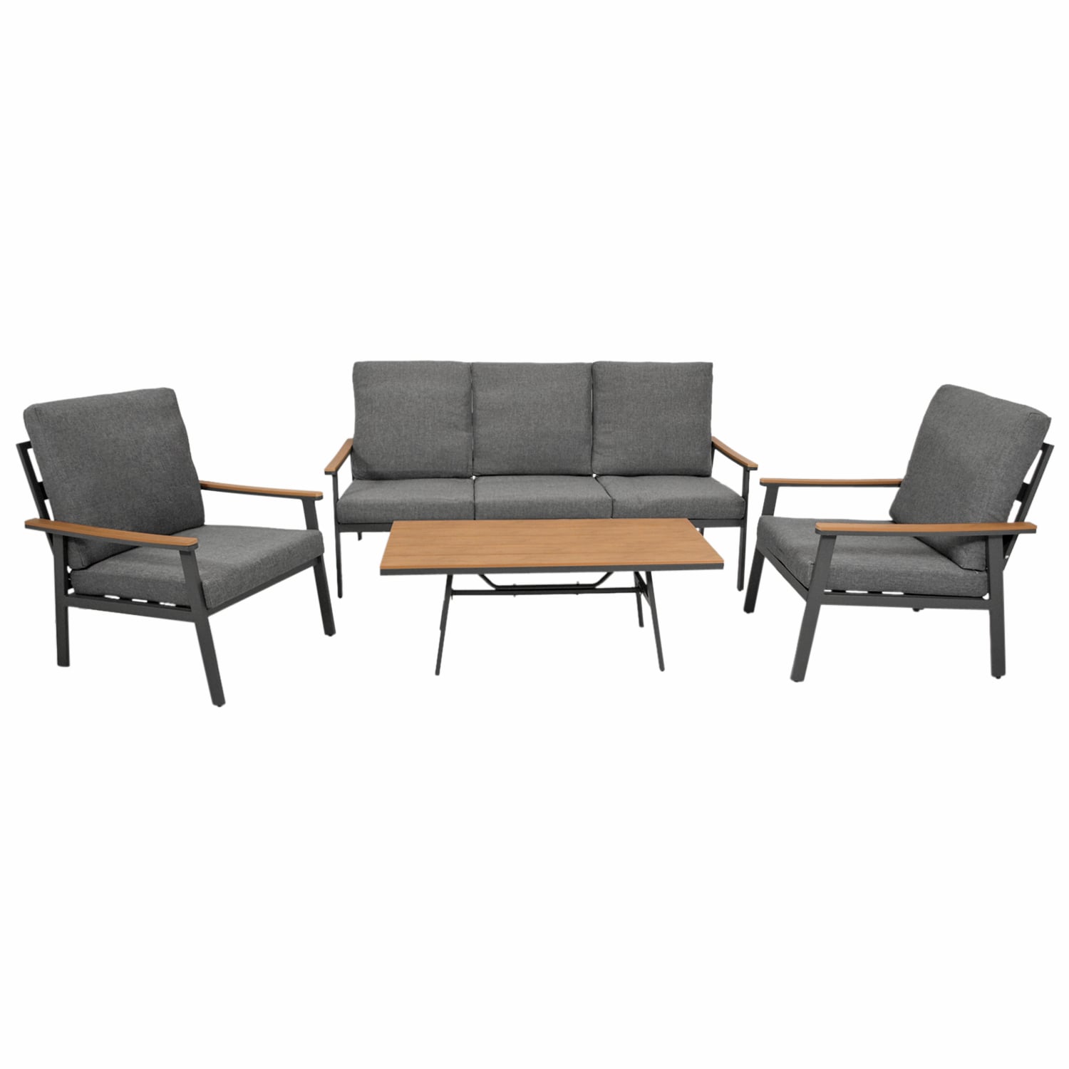 Loungeset 4-teilig (1x 3-sitzer Sofa mit Polster, 2x 1-sitzer Lehnensessel mit Polster, 1x Kaffetisch), Aluminium + Kunstholz