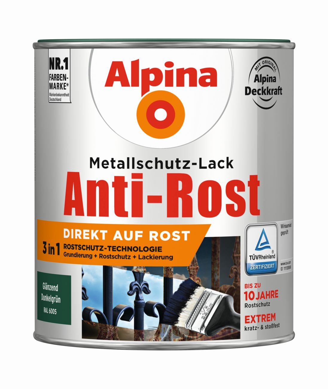 Starke Verbindung: Alpina Anti-Rost Metallschutz-Lack vereint eine ausgezeichnet haftende Grundierung, wirkungsvollen Langzeit-Korrosionsschutz und eine dickschichtige Lackierung. Damit verringert sich der Zeitaufwand der Verarbeitung deutlich.