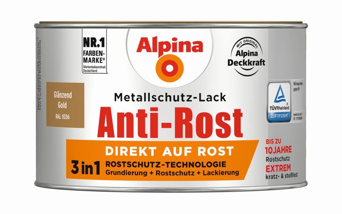 Starke Verbindung: Alpina Anti-Rost Metallschutz-Lack vereint eine ausgezeichnet haftende Grundierung, wirkungsvollen Langzeit-Korrosionsschutz und eine dickschichtige Lackierung. Damit verringert sich der Zeitaufwand der Verarbeitung deutlich.