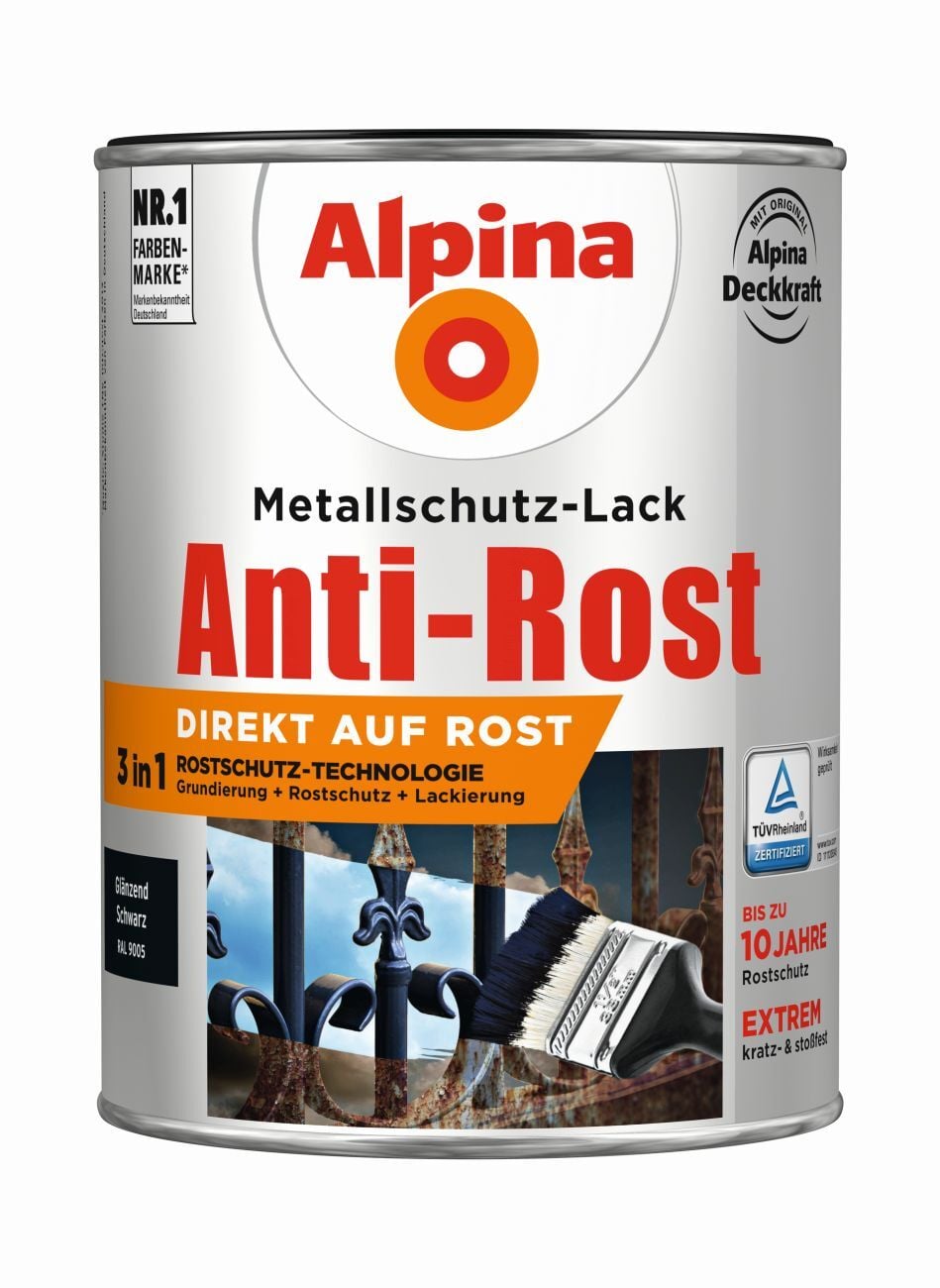 Starke Verbindung: Alpina Anti-Rost Metallschutz-Lack vereint eine ausgezeichnet haftende Grundierung, wirkungsvollen Langzeit-Korrosionsschutz und eine dickschichtige Lackierung. Damit verringert sich der Zeitaufwand der Verarbeitung deutlich.