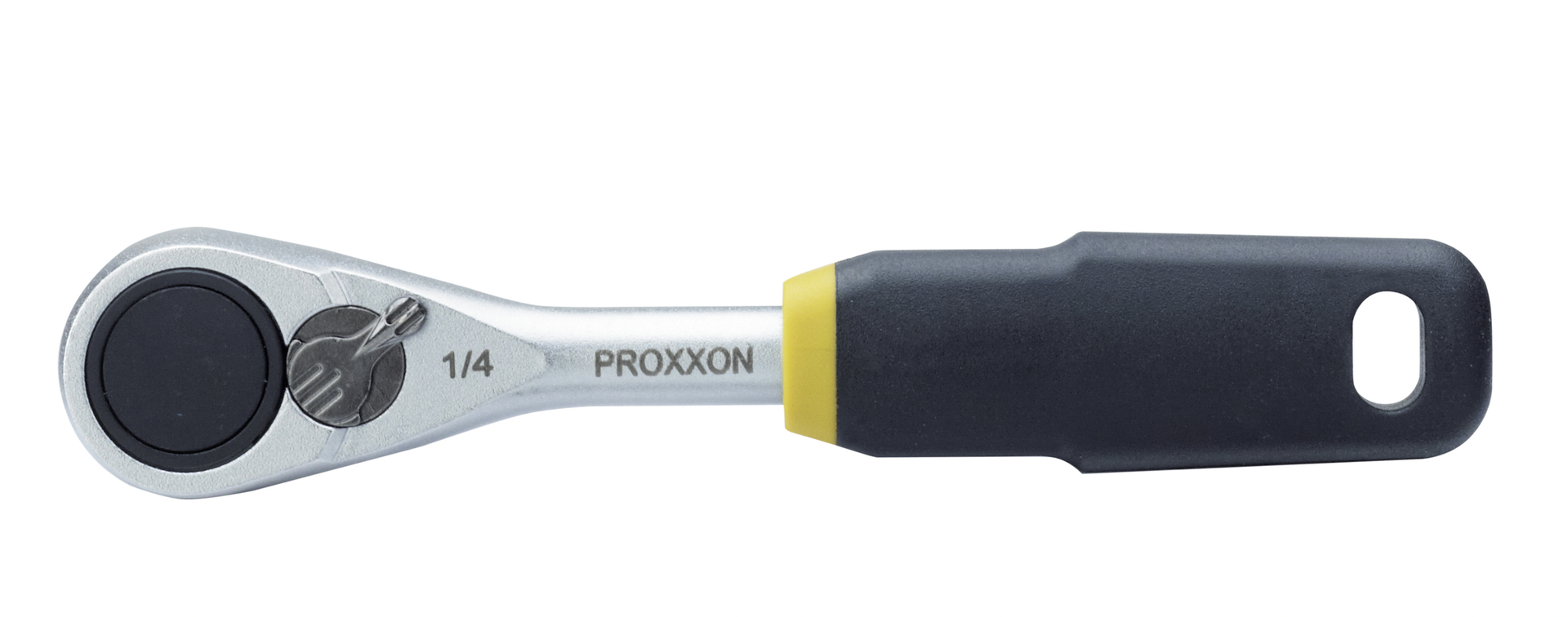 MICRO-Bit-Ratsche mit 1/4″-Sechskantaufnahme von PROXXON. Für knifflige Arbeiten und wo es eng wird! Zum Schrauben im Motorraum, unter der Instrumententafel, am Airbag, für Arbeiten an der Klimaanlage, an der Innenverkleidung, am Schiebedach etc. 1/4″-Bit-Aufnahme mit Magneteinsatz. Distanz von Umschalthebel bis Bit-Spitze nur 30 mm. Umschalthebel für Rechts- und Linkslauf. Entriegelungsmechanismus: Lösen der Einsätze durch Knopfdruck. Aus CrV-Stahl geschmiedet, 2x vernickelt und mattverchromt. Griff aus öl- und säurefestem TPR (Thermoplastic Rubber). Mit praktischer Bohrung zum Aufhängen.