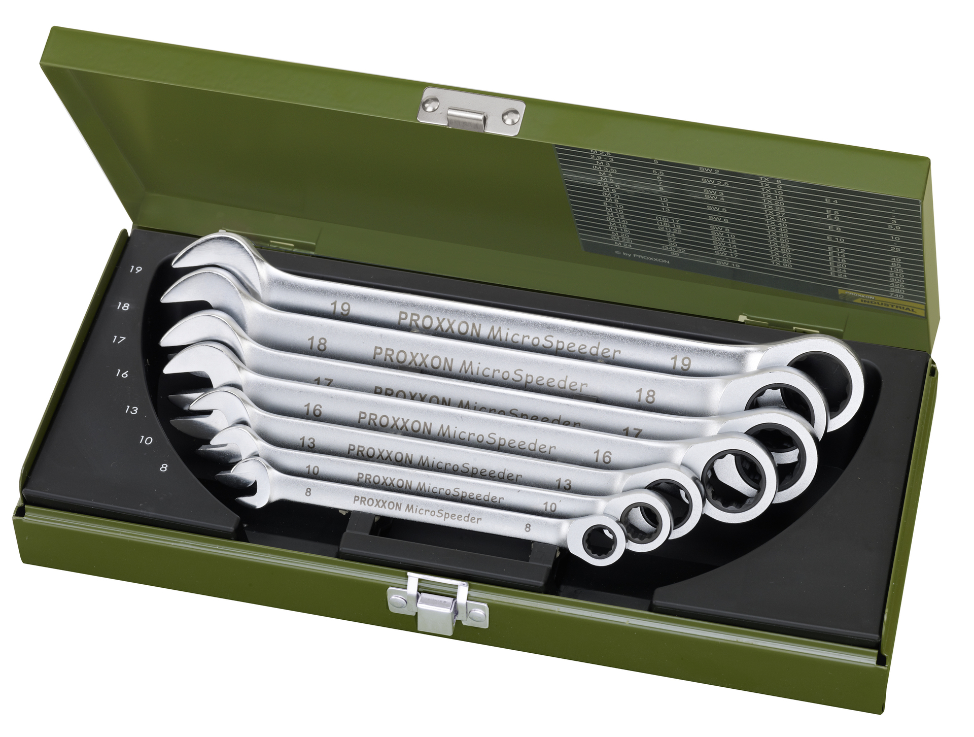 Durch 72-zahnigen Innenring aus hochlegiertem Spezialstahl erfolgt der Antrieb bereits bei einer Hebelbewegung von 5°. Dennoch liegen die übertragbaren Drehmomente weit über DIN/ISO. Schäfte aus CrV-Stahl mit optimalem Oberflächenschutz: 2x vernickelt und 1x mattverchromt. Deutlich lesbare Schlüsselweiten durch Laser-Markierverfahren!