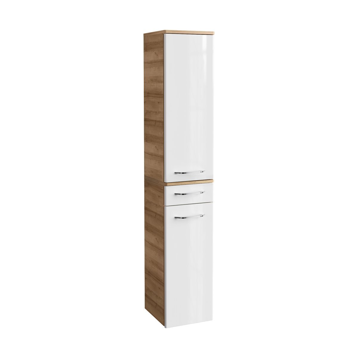 Der Fackelmann Hochschrank bietet viel Stauraum und ist in einer modernen und mediterranen Stilrichtung gestaltet. Der Schrank hat eine Breite von 302mm und eine Höhe von 1652mm. Er wird mit einem Korpus in Ast Eiche Holzoptik und einer Front in weiß geliefert und hat zwei Türen, vier Einlegeböden und eine Schublade. Dank des Soft-Close-Systems schließen die Türen leise und sanft. Der Türanschlag ist frei wählbar. Der Schrank wird in Deutschland hergestellt und bietet eine schnelle Lieferzeit.