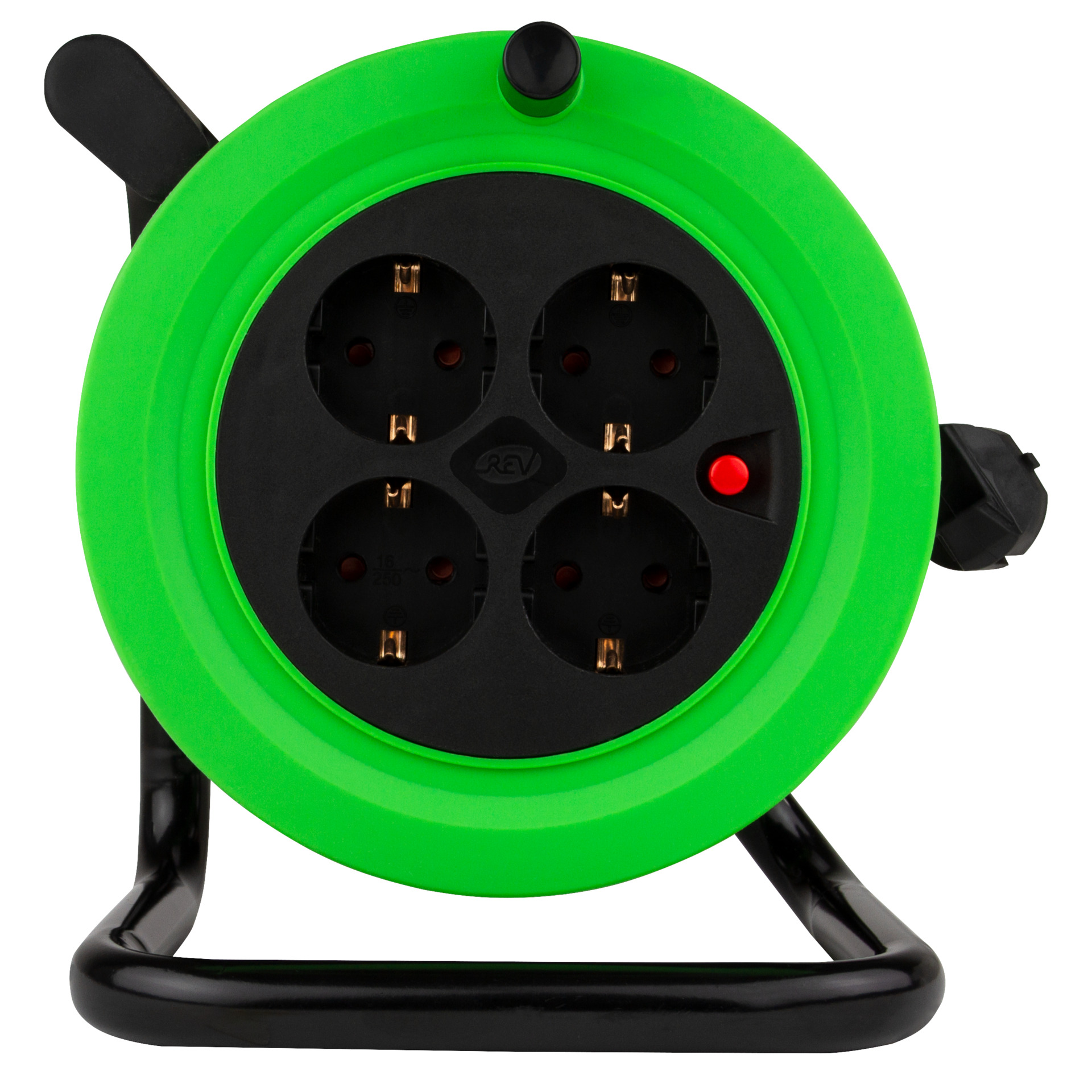 Kabeltrommel mit 4 Schutzkontaktsteckdosen und erhöhtem Berührungsschutz.