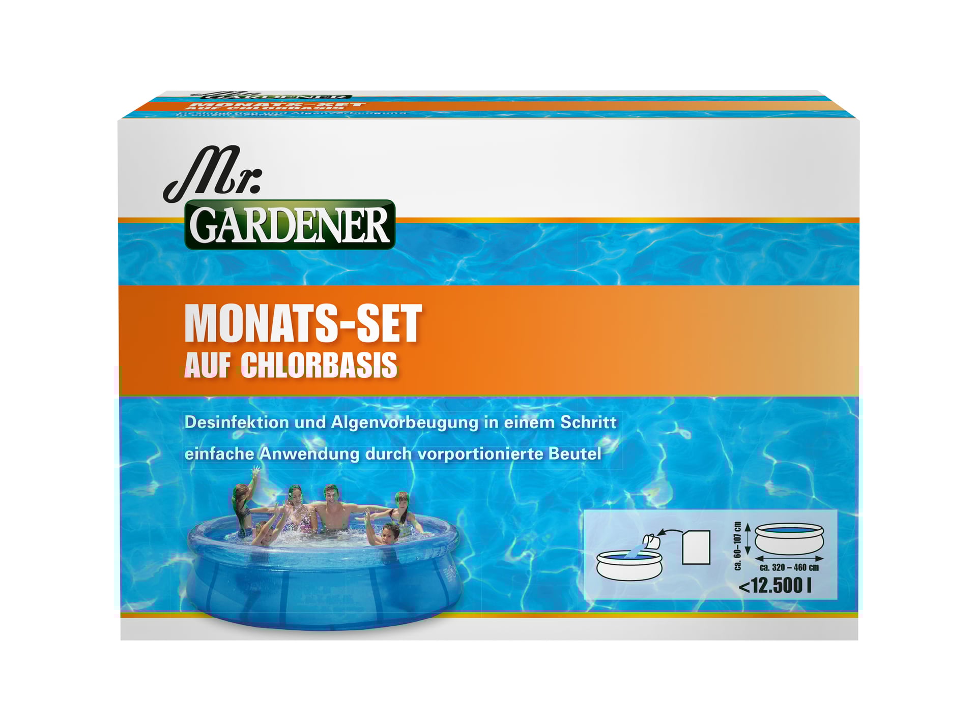 Monatsset Chlor – Desinfektion und Algenvorbeugung auf Chlorbasis in einem Schritt. Für Pools bis 12.500 l Wasserinhalt geeignet.