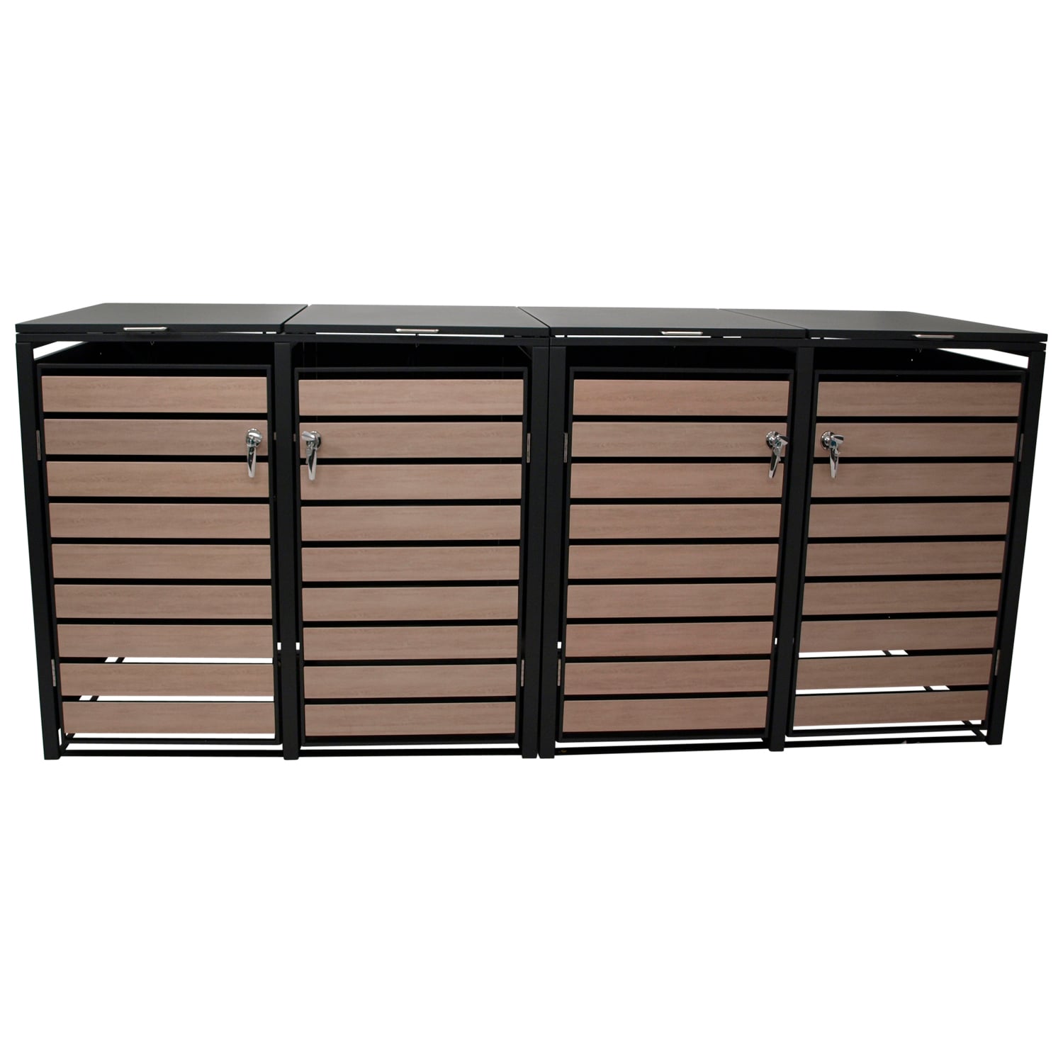 Mülltonnenbox für vier Tonnen bis 240L. Aus verzinktem Stahl, anthrazitfarben pulverbeschichtet. Front in Holzoptik. Deckel mit 2 Gasdruckfedern.
