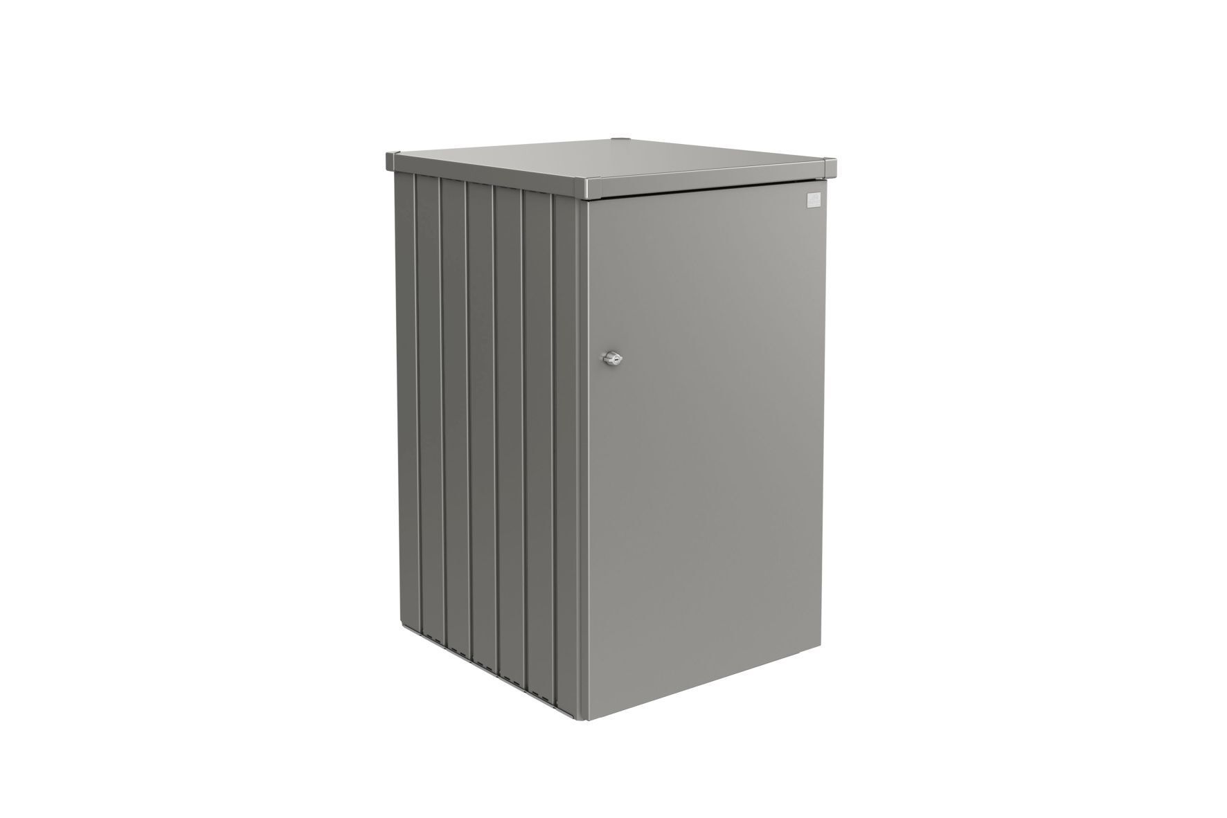 Die Mülltonnenbox Alex ist durch eine modulare Bauweise beliebig erweiterbar. Die Mülltonne lässt sich einfach herauskippen, der Haltebügel hält sie in der Schräglage und erleichtert die Befüllung.