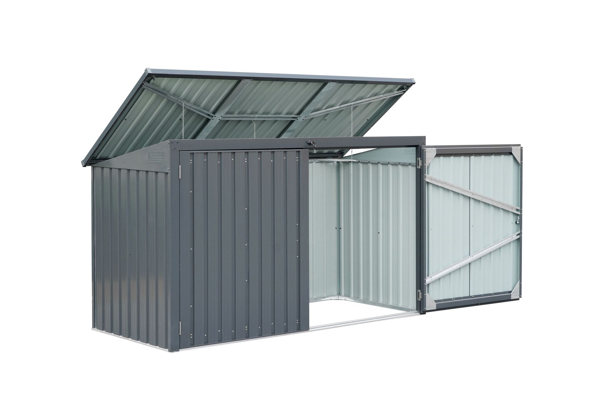 Die Mülleimer-Garage schützt Abfallbehälter sicher vor starken Winden und direkter Sonneneinstrahlung. So können diese nicht mehr umfallen und der Geruchsbildung wird vorgebeugt. Die Öffnungsklappe hält dank der verbauten Gasdruckfeder von selbst in der geöffneten Position. Die breite Doppel-Fronttu?r ermöglicht ein bequemes Ein- und Ausfahren der Mu?lltonnen. Die stabile Mu?lleimer-Garage besteht aus einem verzinkten Bodenrahmen und Stahlblech-Seitenwänden. In den Seitenwänden sind Belu?ftungsgitter integriert. Sowohl Öffnungsklappe wie auch die Fronttu?r sind abschließbar.