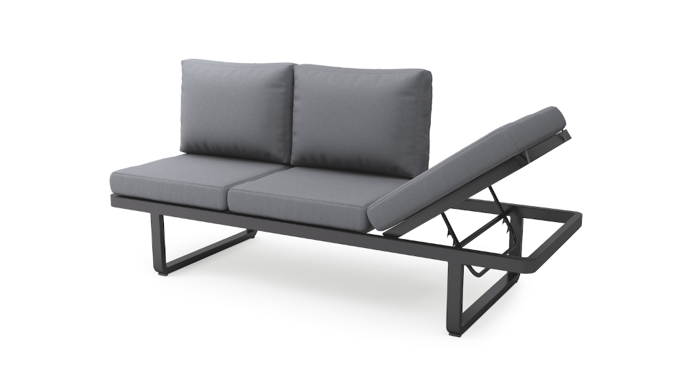 Bequem gepolsterte Gartenliege mit höhenverstellbarem Seitenteil, das sowohl als dritte Sitzfläche als auch als gemütliche Rückenlehne in verschiedensten Sitzhöhen genutz werden kann. Schnappt euch ein Buch und genießt euren Feierabend!