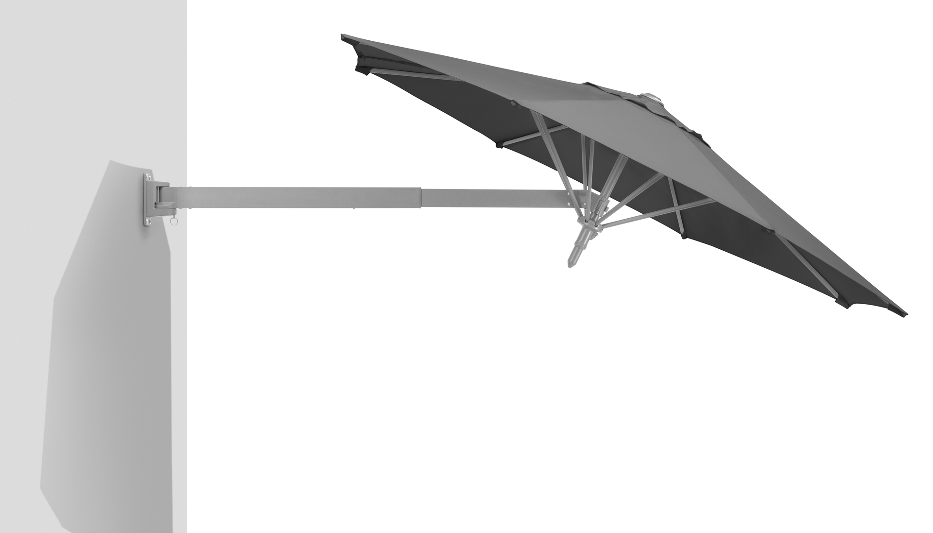 Mittels Knicker mit Druckknopf lässt sich der Schirm einfach neigen. In Kombination mit der Möglichkeit, den Schirm 180° zu schwenken, gewährleistet dieser Wandschirm zu jeder Tageszeit einen Schattenplatz. Die Streben sind 12 x 18 mm. Der Schirm lässt sich vom Ausleger abnehmen und somit über die Winterzeit einfach einlagern.
