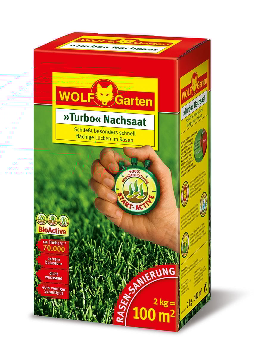 Der Turbo-Nachsaatrasen von WOLF-Garten erlaubt eine bis zu 30% schnellere Keimung und 20% mehr gekeimte Pflanzen. Die Turbo-Nachsaat-Mischung von WOLF-Garten ist extrem belastbar und sehr dicht. Dank der BioActive Technik wurde die Wurzelbildung und die Widerstandsfähigkeit gegenüber Trockenheit und Hitz/Kälte verbessert.