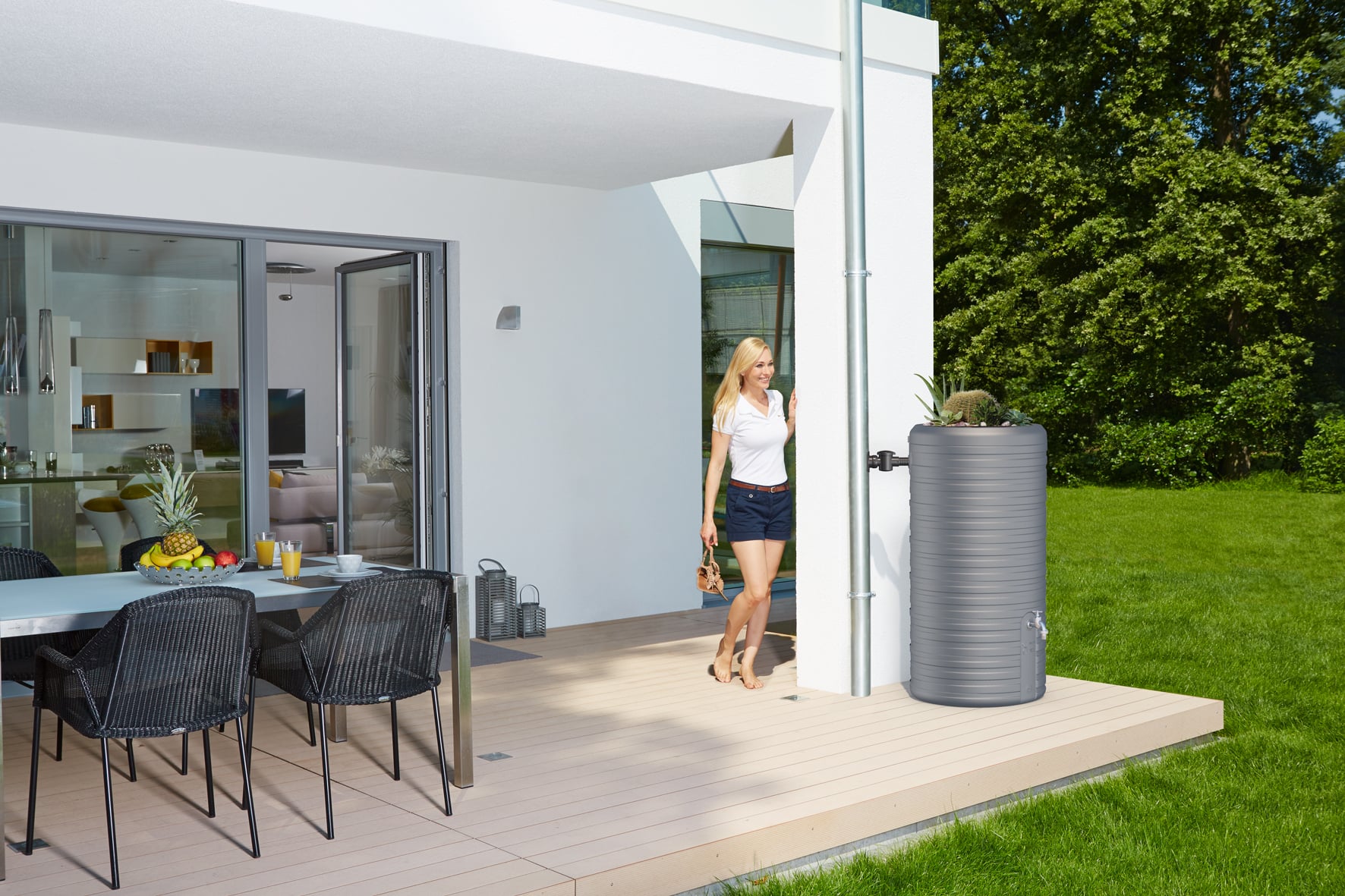 Der Regenwasserbehälter in nordisch schlichtem Design Premiumqualität mit 5 Jahren Garantie Regenwasserspeicher mit integrierter Pflanzschale und Filtervlies Die integrierte Pflanzschale mit Komfort-Entnahme und einer Tiefe von 20 cm ermöglicht eine individuelle Gestaltung Zusätzlicher Komfortanschluss für die Wasserentnahme mit dem Universal-Schlauchset (Zubehör) oder zur Restentleerung vor der Frostperiode