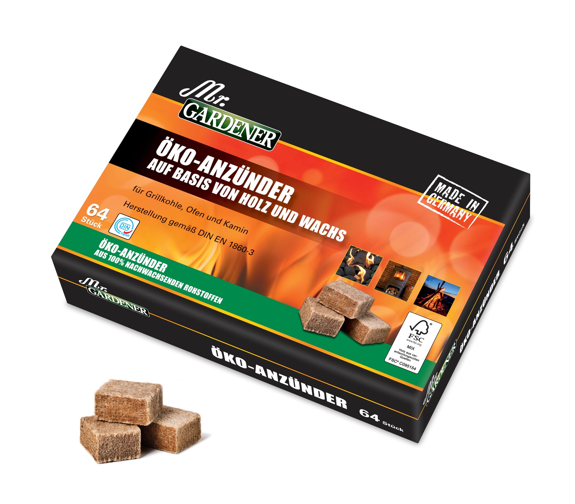 Anzündwürfel aus Holz & Wachs zum sicheren und gerucharmen Anzünden von Grill, Ofen und Kamin.