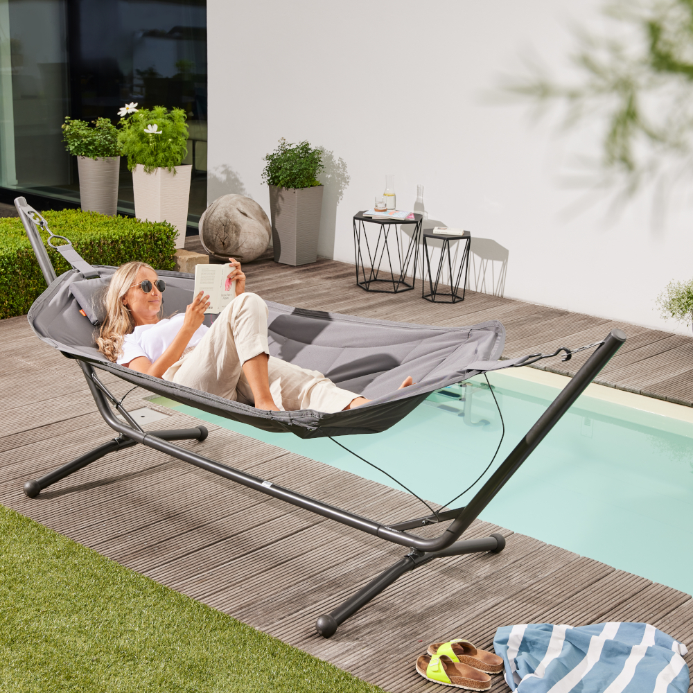 Hängematte Panama, Gestell aus Stahl pulverbeschichtet in grau, Flächen aus Oxfordgewebe 600D, PVC beschichtet in dunkelgrau