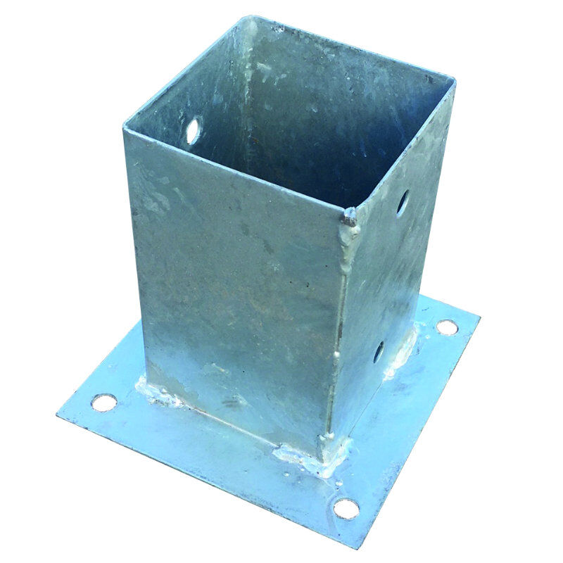 Pfostenträger mit Grundplatte – 9 × 9 × 15 cm, verzinkt Stabiler Pfostenträger zum Aufschrauben auf festen Untergrund Der verzinkte Pfostenträger mit Grundplatte ermöglicht eine einfache und sichere Befestigung von Holzpfosten auf festen Untergründen wie Betonfundamenten, Mauersockeln oder Terrassenplatten. Durch die massive Grundplatte bietet er zuverlässigen Halt für Vorgartenzäune, leichte Sichtschutzelemente oder Terrasseneinfassungen. Produktdetails Material: Stahl, verzinkt Maße Pfostenträger: 9 × 9 × 15 cm Grundplatte: 15 × 15 cm Bohrungen: Ø 10 mm Geeignet für Zaunelemente bis ca. 120 cm Höhe Einfache Montage Die rechteckige Grundplatte besitzt vorgebohrte Löcher zur schnellen Verschraubung mit dem Untergrund. Der Pfosten wird direkt in den Träger gesetzt und kann mit passenden Schrauben oder Bolzen fixiert werden. Die Montage ist unkompliziert und auch für Heimwerker gut umsetzbar. Witterungsbeständig und vielseitig einsetzbar Durch die Feuerverzinkung ist der Pfostenträger korrosionsbeständig und für den langfristigen Außeneinsatz geeignet. Er eignet sich optimal für Holzpfosten mit 9 × 9 cm Querschnitt und bietet stabilen Halt bei leichten Zaun- oder Gestaltungselementen im Gartenbereich. Für Garten, Terrasse und Vorgarten Ob als Befestigungslösung für Rankgitter, Sichtschutz oder dekorative Zäune – mit diesem Pfostenträger gelingt eine solide, dauerhafte und optisch saubere Montage auf ebenem Untergrund.