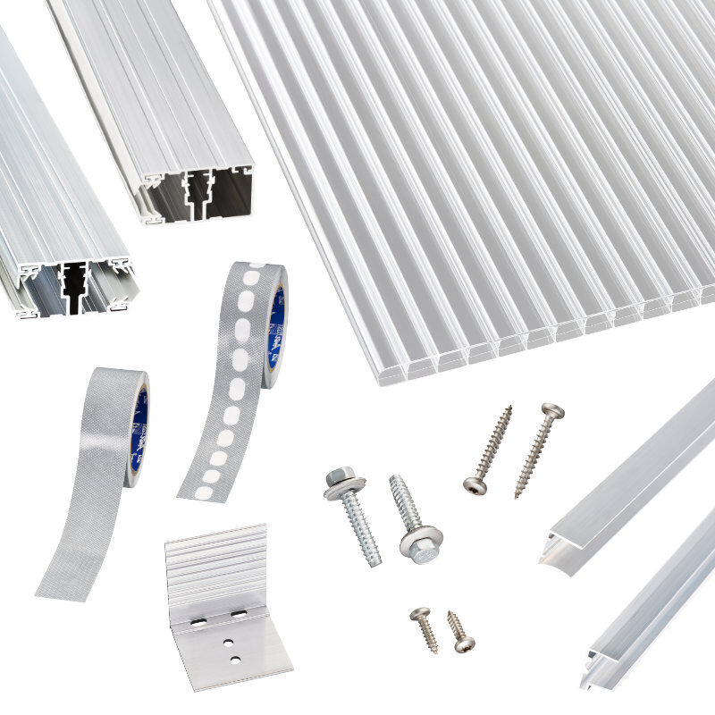 Klar 16 Polycarobonat Holkammerplatte longlife Unser Komplettset enthält alles was Sie für Ihre Terrassenbedachung benötigen (Unterkonstruktion und Zierklemmdeckel nicht enthalten) Die hochwertige Doppelstegplatte klar 16 aus Polycarbonat besticht durch ihre longlife Qualität, hohe Bruchfestigkeit, hohe Temperaturbeständigkeit sowie durch ihre langjährige Lichtdurchlässigkeit. Im Gegensatz zum einfachen Verlegeprofil sind beim hochwertigen Verlegeprofil bereits die Dichtlippen auf Ober- und Unterprofil eingezogen. Diese sorgen für eine hervorragende Abdichtung der Stegplatten. Außerdem verfügt das Unterprofil vom hochwertigen Verlegeprofil zusätzlich über Belüftungsrillen, die für eine optimale Luftzirkulation zwischen Profil und Unterkonstruktion sorgen. Der integrierte Schraubkanal sorgt zudem für eine optimale Verschraubung und Montage der Verlegeprofile. Verfügbare Längen in m: 2,00 – 2,50 – 3,00 – 3,50 – 4,00 – 4,50 – 5,00 – 6,00 – 7,00 Es handelt sich um feste Längen. Bitte geben Sie Ihr Wunschmaß ein, wir schneiden die Platten auf Ihr Wunschmaß zu und legen die Reststücke der Lieferung bei. Hinweise Bei zusätzlicher Montage eines Sonnensegels oder Ähnlichem, muss für eine optimale Belüftung ein Mindestabstand von 40cm gegeben sein, um Hitzestaus zu vermeiden. Nicht geeignet bei landwirtschaftlicher Tierhaltung, da die Ammoniaksäure das Material angreift! Hinweise zur Lagerung nach der Lieferung sind unbedingt zu beachten!