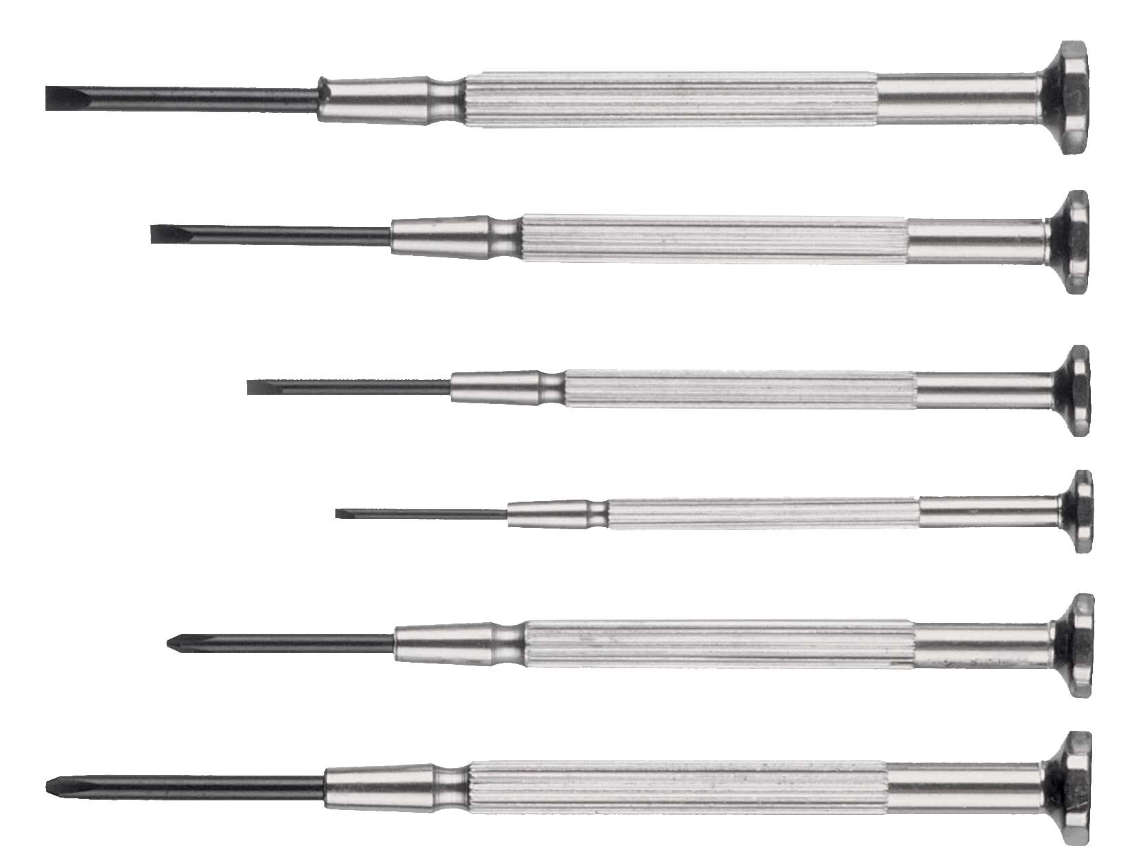 Bestehend aus: 4 Schlitzschraubendreher, Größen: 1,4 – 2,0 – 2,4 – 3,0 mm 2 Kreuzschlitzschraubendreher, Größen: PH 2,4 – 3,0 mm.