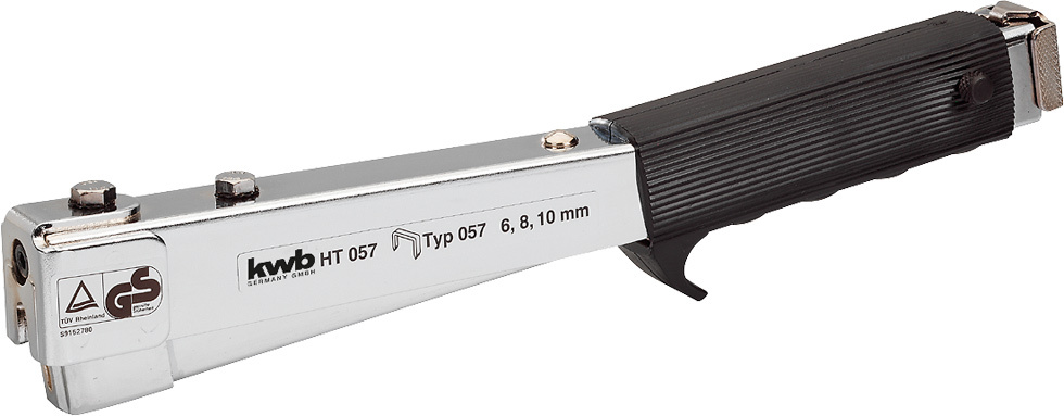 Der kwb PROFI Hammertacker HT 057 verfügt über einen Handgriff mit Fingerschutz. Das Magazin fasst bis zu 160 Heftklammern vom Typ 057 bis zu 10 mm.