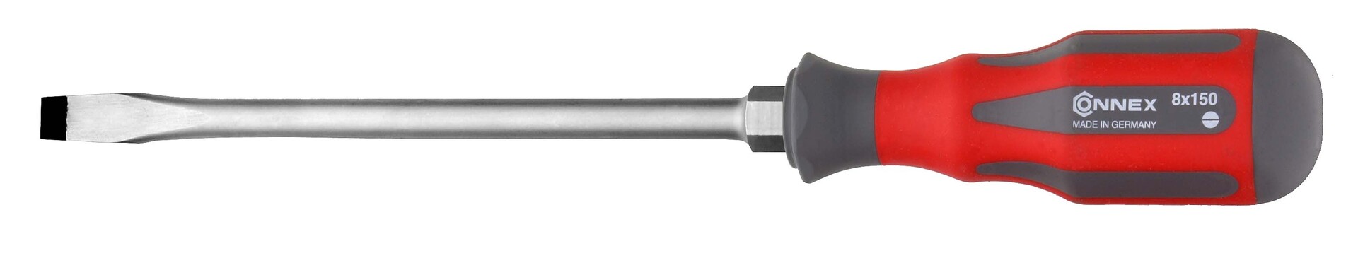 CONNEX Profi-Schraubendreher mit Werkstatt-Schlitz und Sechskantansatz.. Die ergonomische Grifform durch optimiertes Oberflächendesign gewährleistet ein optimales Umgreifverhalten und höchste Kraftübertragung für ein sicheres und ermüdungsfreies Schrauben. Der Griff ist extrem schlagfest. Die Klinge besteht aus hochlegiertem, zähhartem Chrom- Vanadium-Spezialstahl ist für stärkste Beanspruchung geeignet. Die Oberfläche ist glanz-verchromt. Durch die brünierte Spitze ist eine große Passgenauigkeit gesichert. Made in Germany.