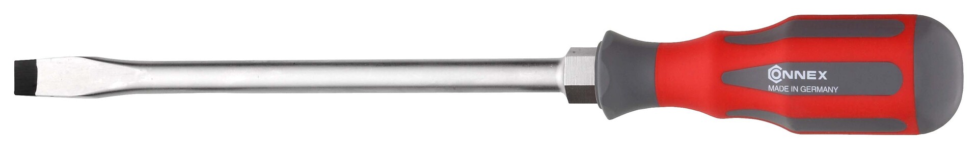 CONNEX Profi-Schraubendreher mit Werkstatt-Schlitz und Sechskantansatz.. Die ergonomische Grifform durch optimiertes Oberflächendesign gewährleistet ein optimales Umgreifverhalten und höchste Kraftübertragung für ein sicheres und ermüdungsfreies Schrauben. Der Griff ist extrem schlagfest. Die Klinge besteht aus hochlegiertem, zähhartem Chrom- Vanadium-Spezialstahl ist für stärkste Beanspruchung geeignet. Die Oberfläche ist glanz-verchromt. Durch die brünierte Spitze ist eine große Passgenauigkeit gesichert. Made in Germany.