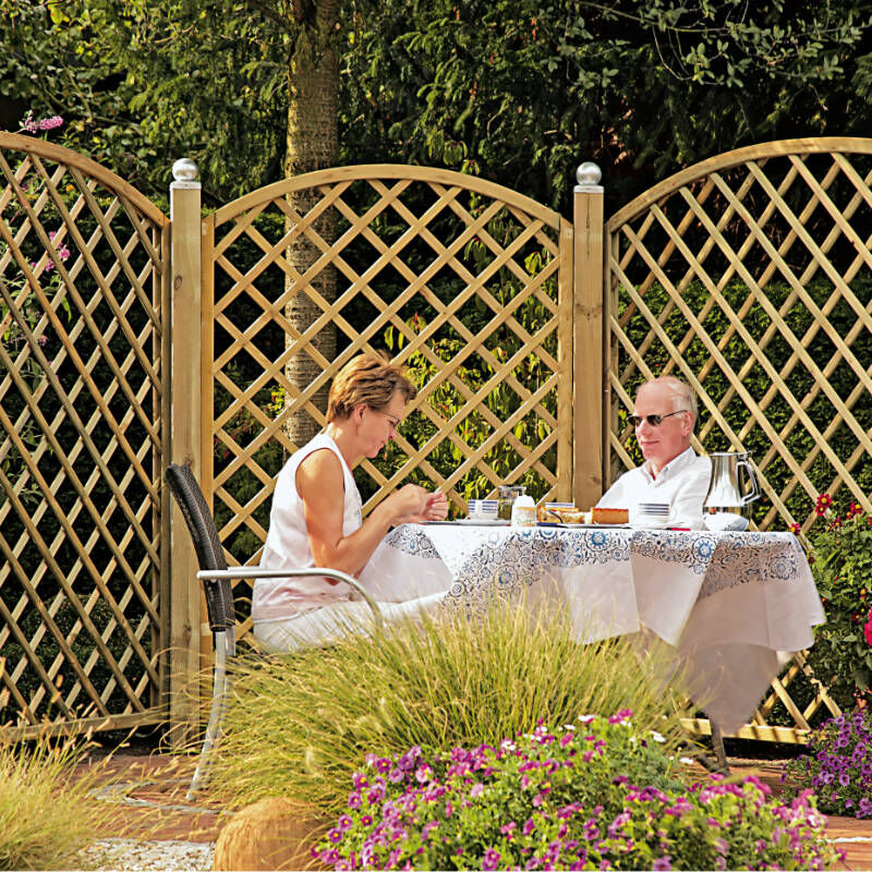 Der Rankzaun Bogen ist ideal, wenn du deinen Garten nicht nur abgrenzen, sondern auch dekorativ begrünen möchtest. Durch den geschwungenen Bogenabschluss wirkt das Element besonders harmonisch und passt super zu Terrassen, Vorgärten und liebevoll angelegten Beeten. Das Rankgitter bietet dir stabilen Halt für Kletterpflanzen wie Rosen, Clematis oder Efeu. So entsteht mit der Zeit ein grüner, lebendiger Sichtschutz, der Bereiche trennt, ohne sie optisch zu schwer wirken zu lassen. Perfekt als begrünter Abschluss an der Grundstücksgrenze oder als schöner Rahmen für eine Sitzecke. Technische Daten Material Holz, Kiefer/Fichte Zaunfarbe Druckimprägniert grün (KDI) Form Bogenabschluss Rahmen 45 x 45 mm Rankstäbe 12 x 30 mm, geriffelt Befestigung Rahmen und Rankstäbe verzinkt geklammert Maschenweite 10 x 10 cm Zaunmaße B x H 120 x 180/160 cm, 180 x 180/160 cm Irrtümer oder Änderungen vorbehalten.