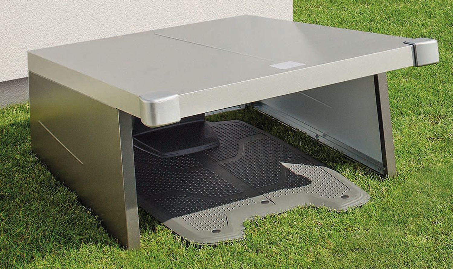Schützt Ihren Rasenroboter vor Regen und UV-Strahlung, Wetterfest – die Biohort-Robotergarage kann auch im Winter draußen stehen bleiben, Einfacher Zugriff auf das Bedienpaneel durch aufklappbaren Deckel