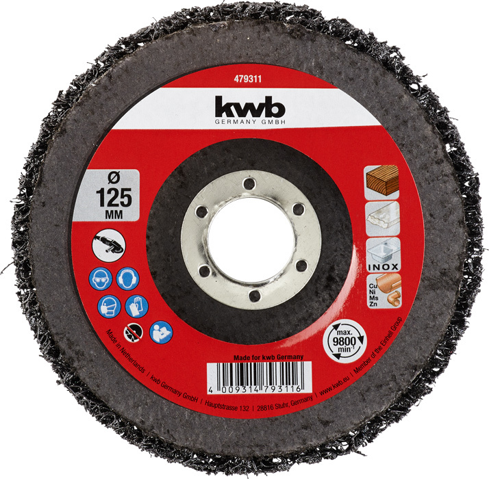 Die kwb Reinigungsscheibe für Winkelschleifer mit einer Umfangsgeschwindigkeit von 80 m/s besteht aus Nylonelementen die mit Siliziumkarbid Schleifkorn gebunden sind. Die Nutzbreite der Scheibe von 13 mm ermöglicht randgenaues Arbeiten. Die flexible Schleifscheibe ist ideal zum Bearbeiten von Stirn- oder Seitenflächen, Schleifen und Reinigen von Stahl, Blech, Holz, Kunststoffe und Stein geeignet.