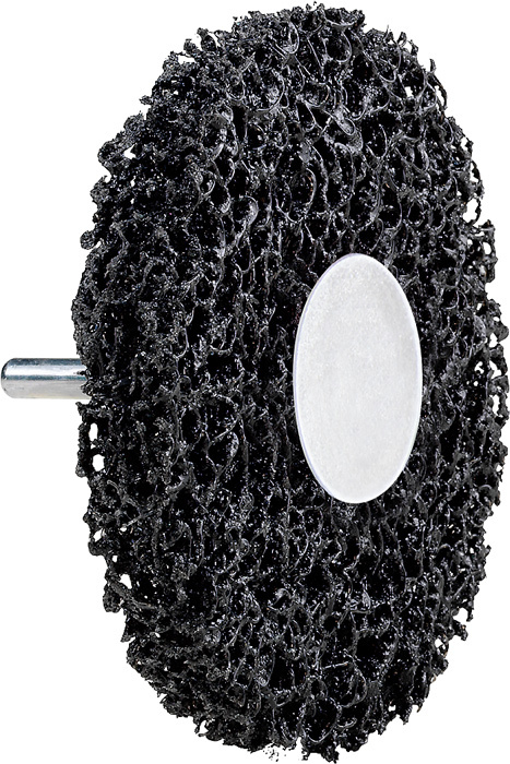 Reinigungsscheibe, grob, zum Schleifen mit Stirn- oder Seitenfläche, flexibel, Nylonfilamente mit Siliziumkarbid Schleifkörpern verbunden, zum Reinigen und Entrosten von Stahlblech, NE-Metallen, Kunststoff, Stein und Holz, für den Einsatz in Bohrmaschinen, randgenaues Arbeiten möglich.