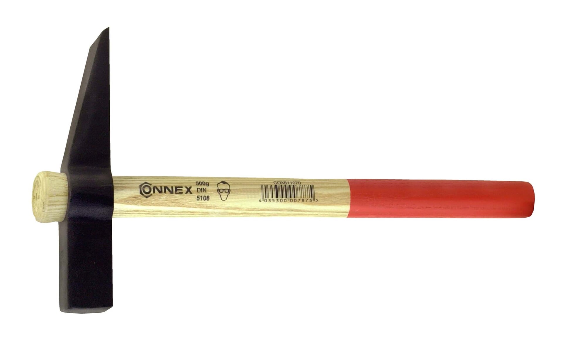 Der rheinische Maurerhammer von CONNEX wiegt 500 g und ist nach DIN 5108 gefertigt. Er hat einen lackierten Eschenholzstiel. Mit VPA/GS Prüfung.