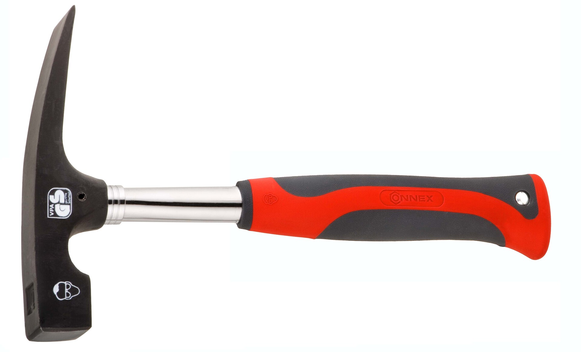 Der rheinische Maurerhammer von CONNEX wiegt 650 g, hat einen Stahlrohrstiel und einen Kunststoffgriff. Mit VPA/GS Prüfung.