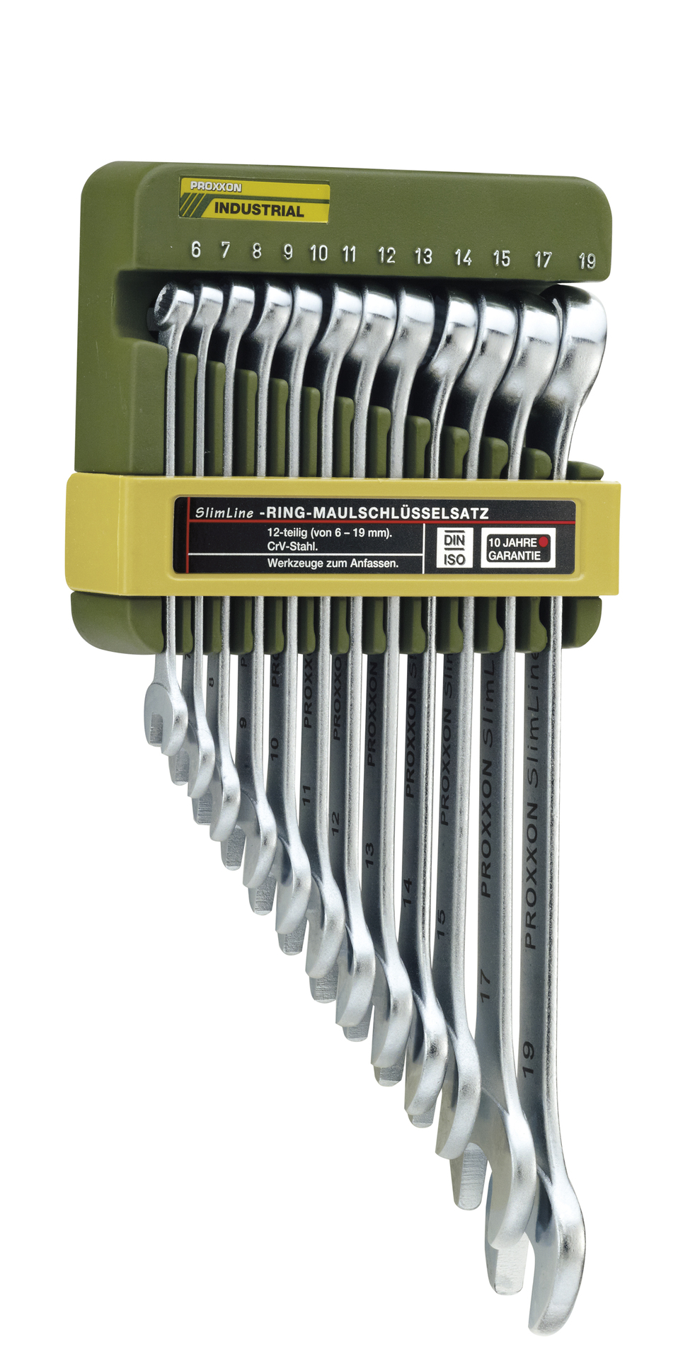 12 Ring-Maulschlüssel (6 – 7 – 8 – 9 – 10 – 11 – 12 – 13 – 14 – 15 – 17 und 19 mm), Halter