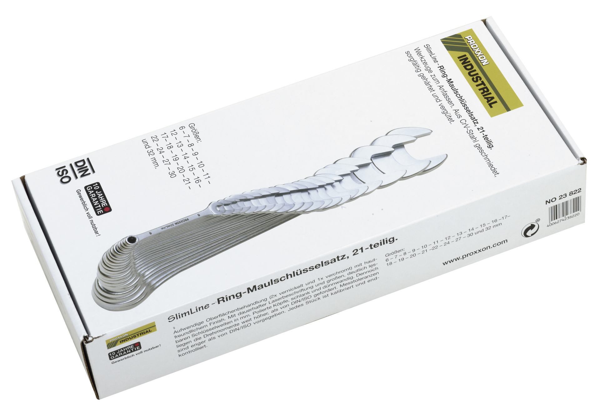 Der Ring-Maulschlüsselsatz von PROXXON wird übersichtlich verpackt im stabilen Karton geliefert. Komplett für Größen 6 – 32 mm. Mit aufwendiger Oberflächenbehandlung (2x vernickelt, 1x verchromt) mit hautfreundlichem Finish. Mit dauerhafter Laserbeschriftung und großen, deutlich lesbaren Schlüsselweiten in mm. Polierte Köpfe, schlank und dünnwandig. Dennoch liegen die Drehmomentwerte weit höher, als von DIN/ISO gefordert. Messtoleranzen sind enger als von DIN/ISO vorgegeben. Gewerblich voll nutzbar!
