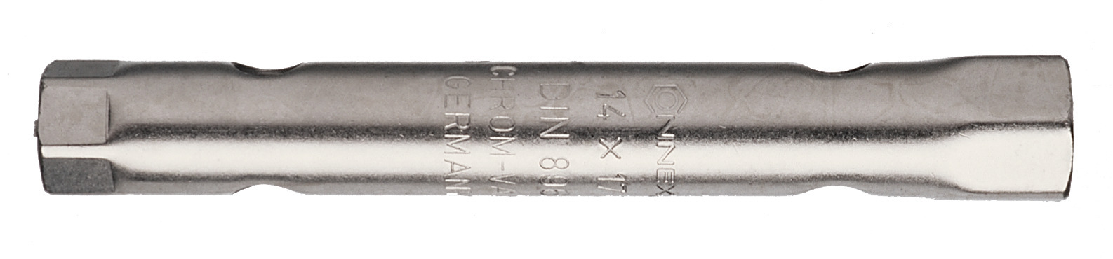 Dieser Rohrsteckschlüssel von CONNEX wurde nach DIN 896 aus Chrom-Vanadium-Stahl gefertigt. Er besitzt eine hohe Passgenauigkeit. Mithilfe eines Schraubendrehers o. ä. kann das Drehmoment erhöht werden. Made in Germany.