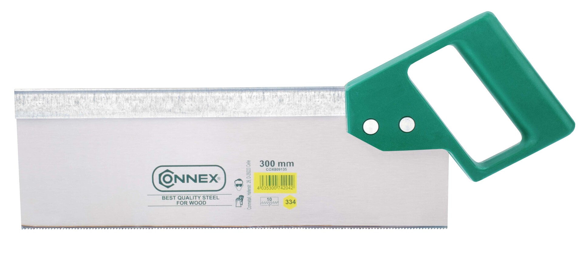 CONNEX Rückensäge 300mm mit Kunststoffgriff, geschliffene und gehärtete Zähne (nicht nachschärfbar), Rücken 1,5 mm stark, bestückt mit 10 Zähnen per 2,54cm (1 Zoll). Für saubereund feine Gehrungsschnitte.