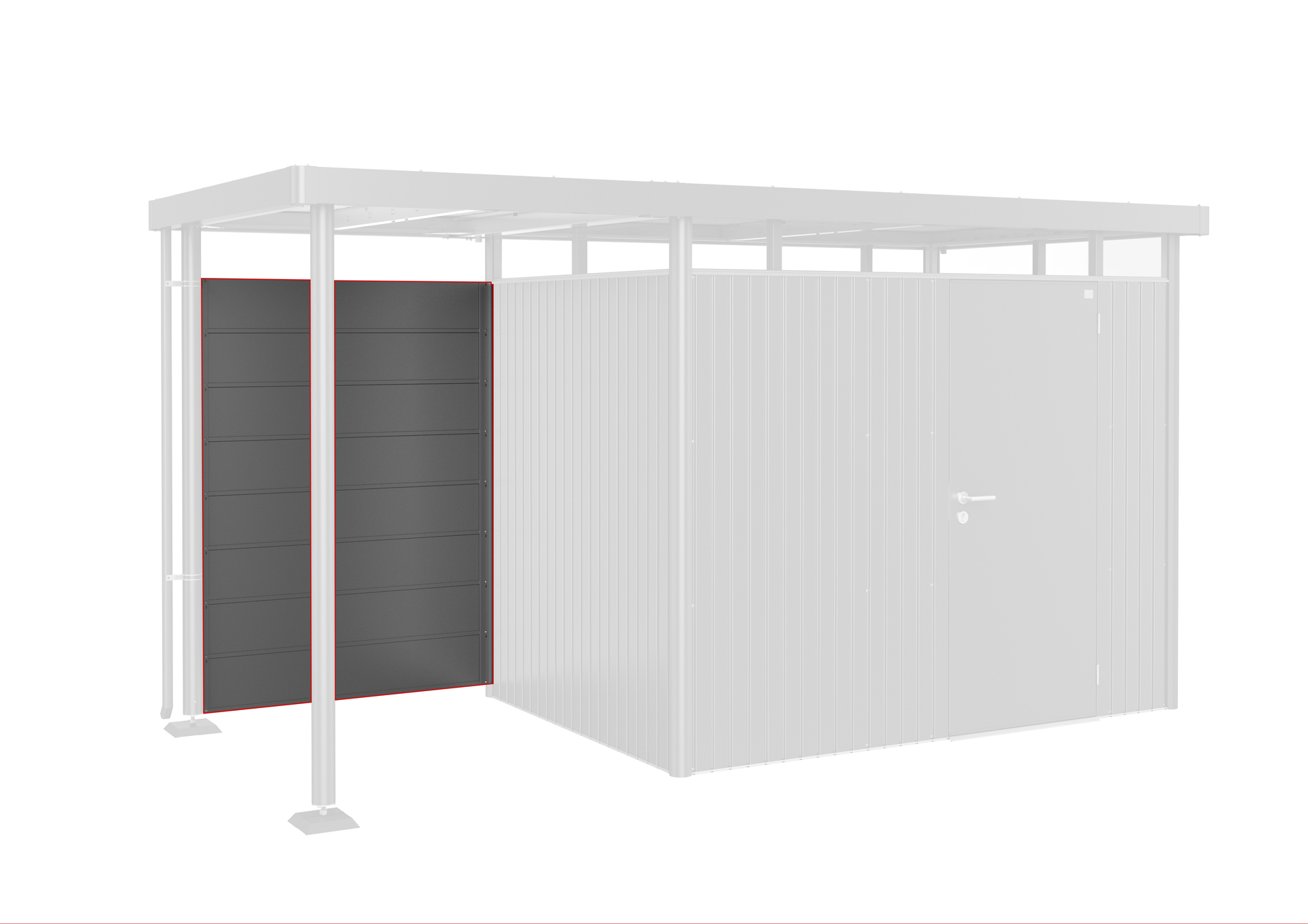 Wahlweise werden eine Rückwand und/oder eine Seitenwand am Seitendach des Gerätehauses HighLine (ab Gr. H2) angebracht. Sie sind in den Farbe des Hauses erhältlich.