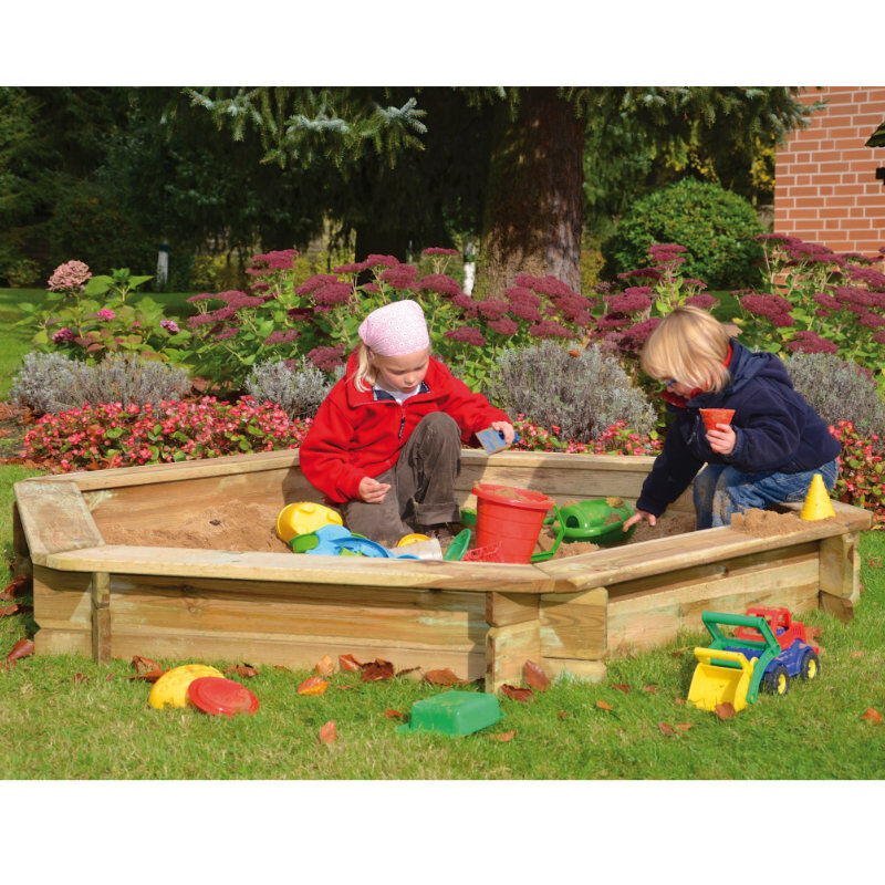 BENNY Sandkasten – großzügiger Spielbereich mit Sitzkomfort Robuster Sandkasten für den Garten Der BENNY Sandkasten ist die ideale Wahl für alle, die ihren Kindern viel Platz zum Buddeln, Bauen und Spielen bieten möchten. Er besteht aus langlebigem Kiefern- und Fichtenholz, das durch eine Kesseldruckimprägnierung optimal vor Witterungseinflüssen geschützt ist. Die sechseckige Form verleiht dem Sandkasten nicht nur ein ansprechendes Design, sondern sorgt auch für eine großzügige Spielfläche. Mit umlaufender Sitzfläche Besonders praktisch ist die integrierte, umlaufende Sitzfläche. Sie bietet Kindern einen bequemen Platz zum Sitzen während des Spielens – oder lädt Eltern zum Zuschauen ein. Dank der stabilen Ausführung eignet sich der Sandkasten ideal für den langfristigen Einsatz im Garten. Technische Daten Material: Kiefer/Fichte, druckimprägniert Form: sechseckig Maße: 180/200 cm (Durchmesser) Brettermaß: 27 x 146 mm Mit umlaufender Sitzfläche Spielspaß mit Qualität Ob im privaten Garten oder auf Spielplätzen – der BENNY Sandkasten bringt Freude und Abwechslung in den Alltag. Die solide Verarbeitung und das durchdachte Design machen ihn zu einem langlebigen und sicheren Spielbereich für Kinder.