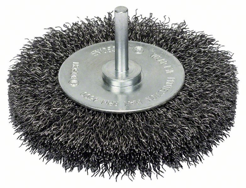 Scheibenbürste mit Spannschaft 6 mm. Stahlbürste mit gewelltem Draht für Bohrmaschinen. Scheibenbürste für leichte bis mittelschwere Reinigungsarbeiten auf kleinen Metallflächen, in Rillen oder an Kanten. Bestens geeignet für Reinigungsarbeiten wie z. B. Entfernen von Farbe, Rost, Zunder, Verkrustungen oder Grat mit effektivem Ergebnis. Optimal geeignet für das Entfernen von Anlassfarbe an Schweißnähten. Für alle Elektrowerkzeugmarken geeignet. Durchmesser Bürste: 100 mm, Bürstenbreite: 20 mm, Drehzahl, max. min-1: 4500 U/min. Geeignet für folgende Werkstoffe: Werkstoffe: Stahl, Metall und Eisen. Sicherheitshinweis: Bei Gebrauch bitte Schutzbrille, Staubschutzmaske und Arbeitshandschuhe tragen.