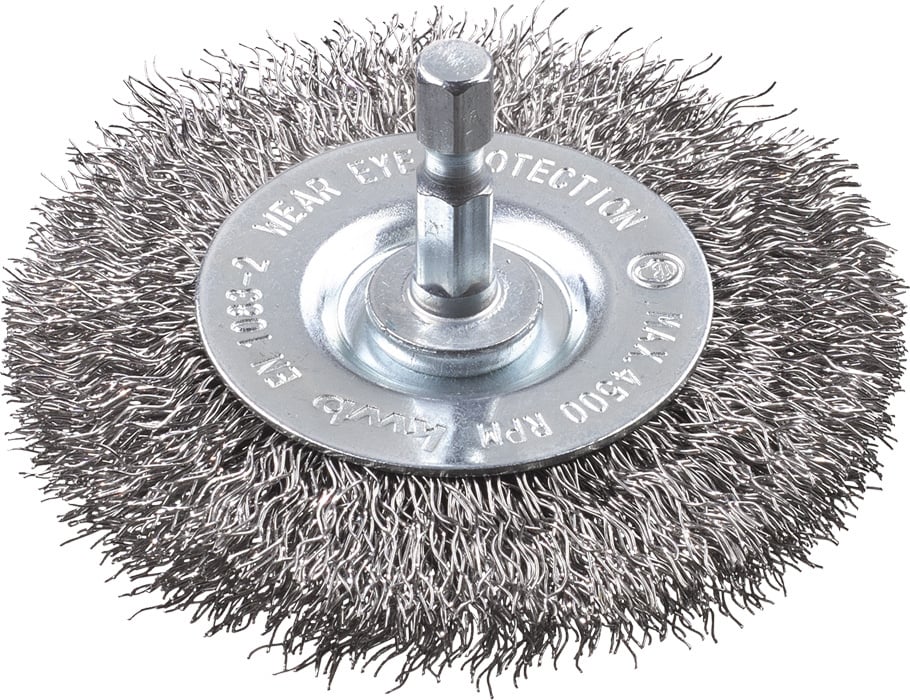 Scheibenbürste, Edelstahl-Draht, rostfrei, gewellt, zum Entrosten, Reinigen, Entfernen von Beschichtungen und Farbe, Entzundern, Entgraten, Aufrauen und Mattieren, für Edelstahl, Metall, Holz und Stein, für Arbeiten an schmalen Kanten, Rahmen, Gittern, Geländern und Rohren, ideal für alle Arbeiten im Außenbereich, hinterlässt keine rostenden Rückstände auf dem bearbeiteten Werkstück.